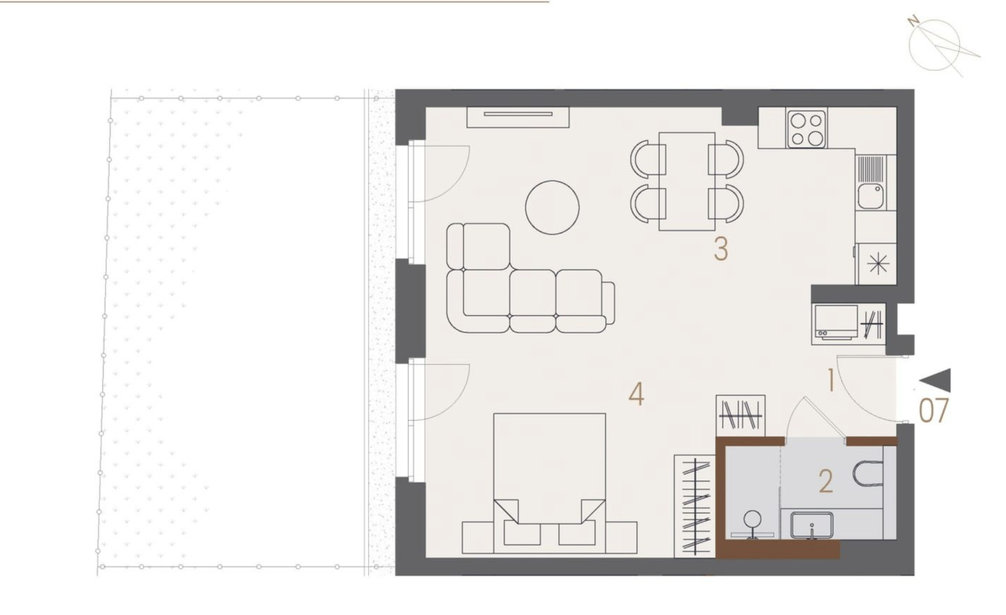 Elastyczność projektu: Możliwość wydzielenia osobnej, komfortowej sypialni oraz słonecznego salonu z aneksem kuchennym.