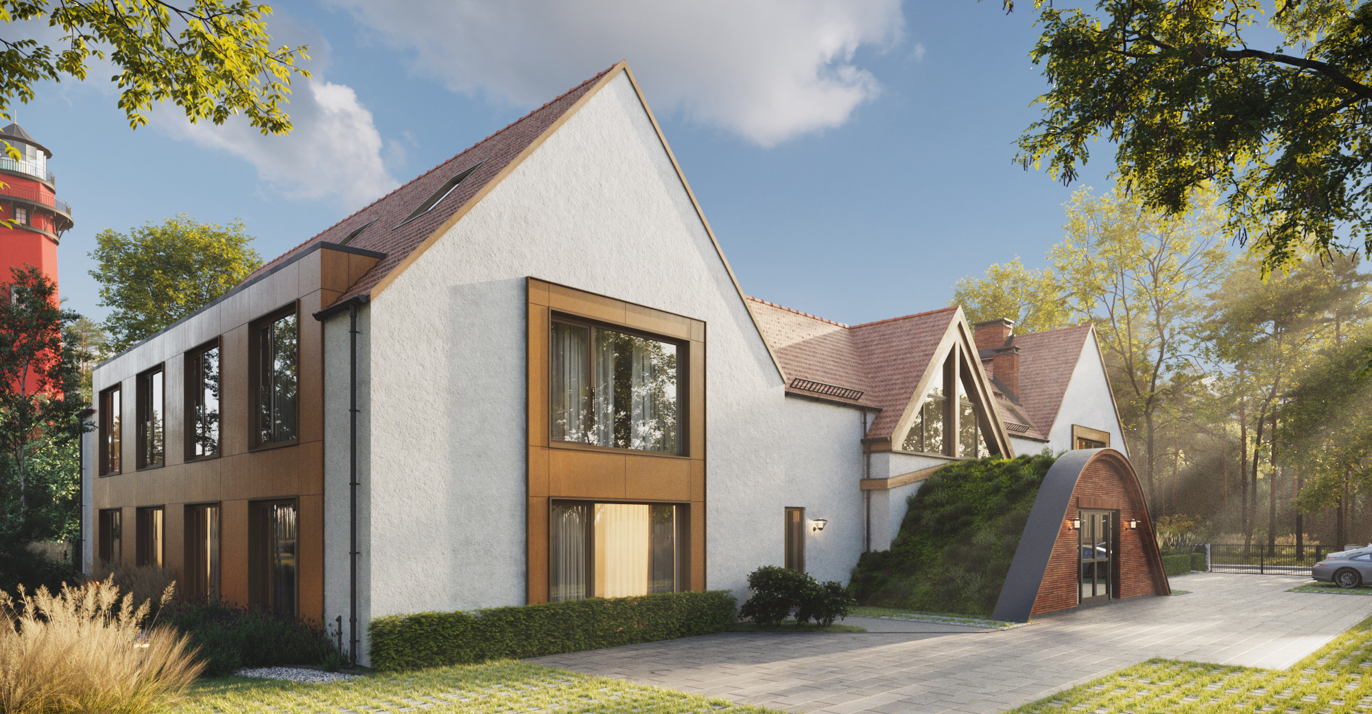Otoczenie: Budynek zatopiony w sosnowym lesie, zapewniający całkowitą prywatność.