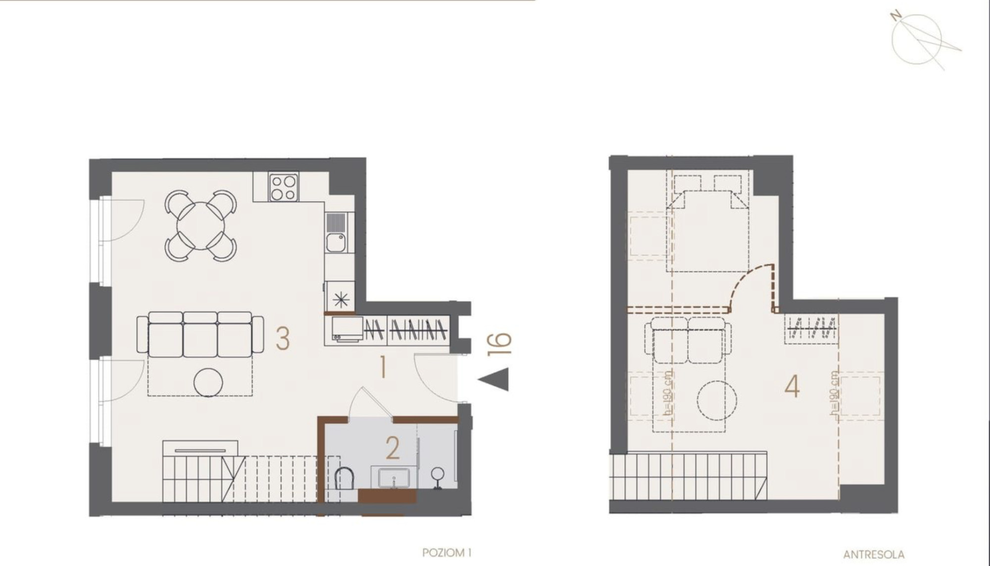 Apartament A16 to dwukondygnacyjna, jasna przestrzeń dająca duże możliwości aranżacyjne: