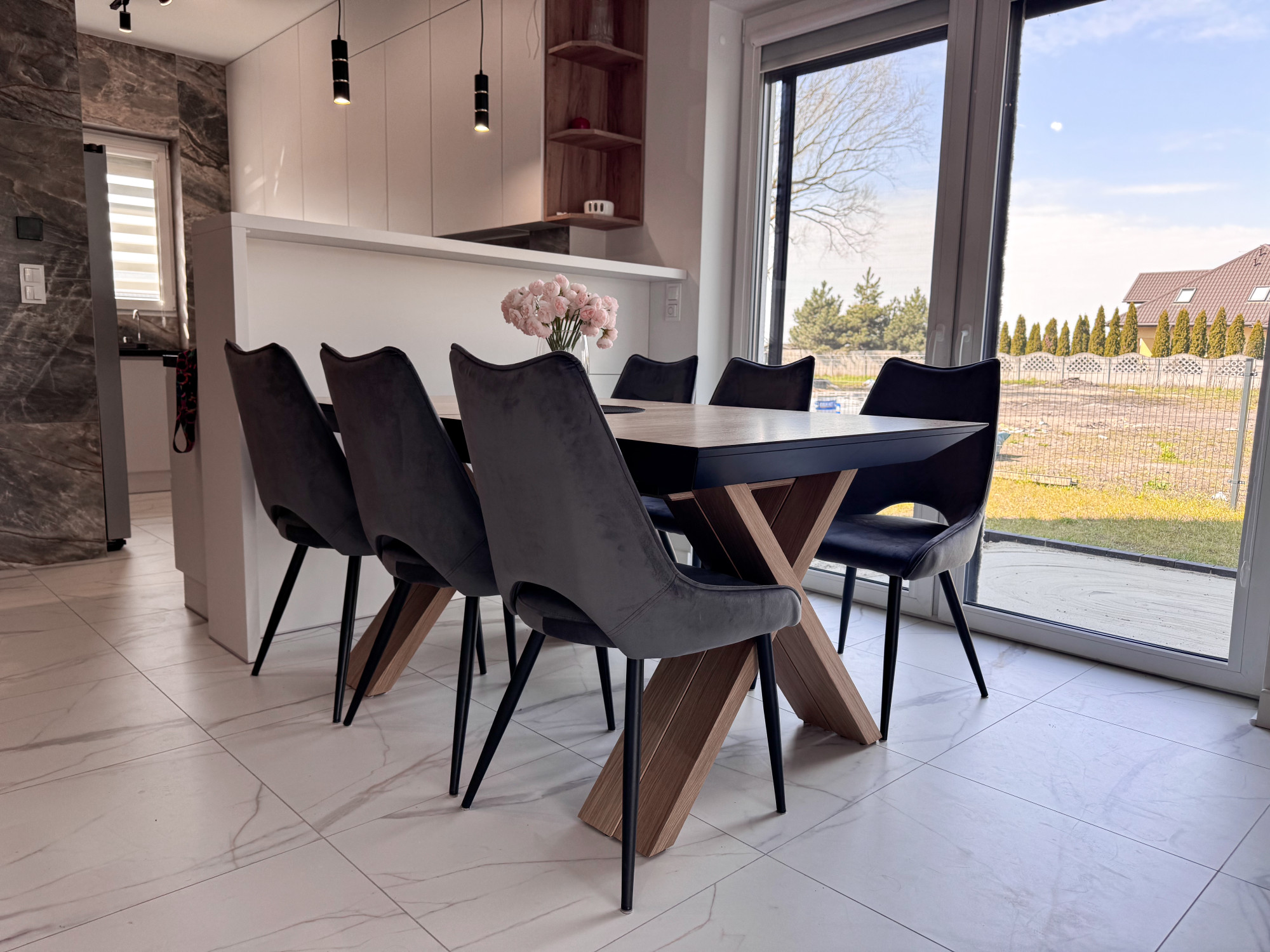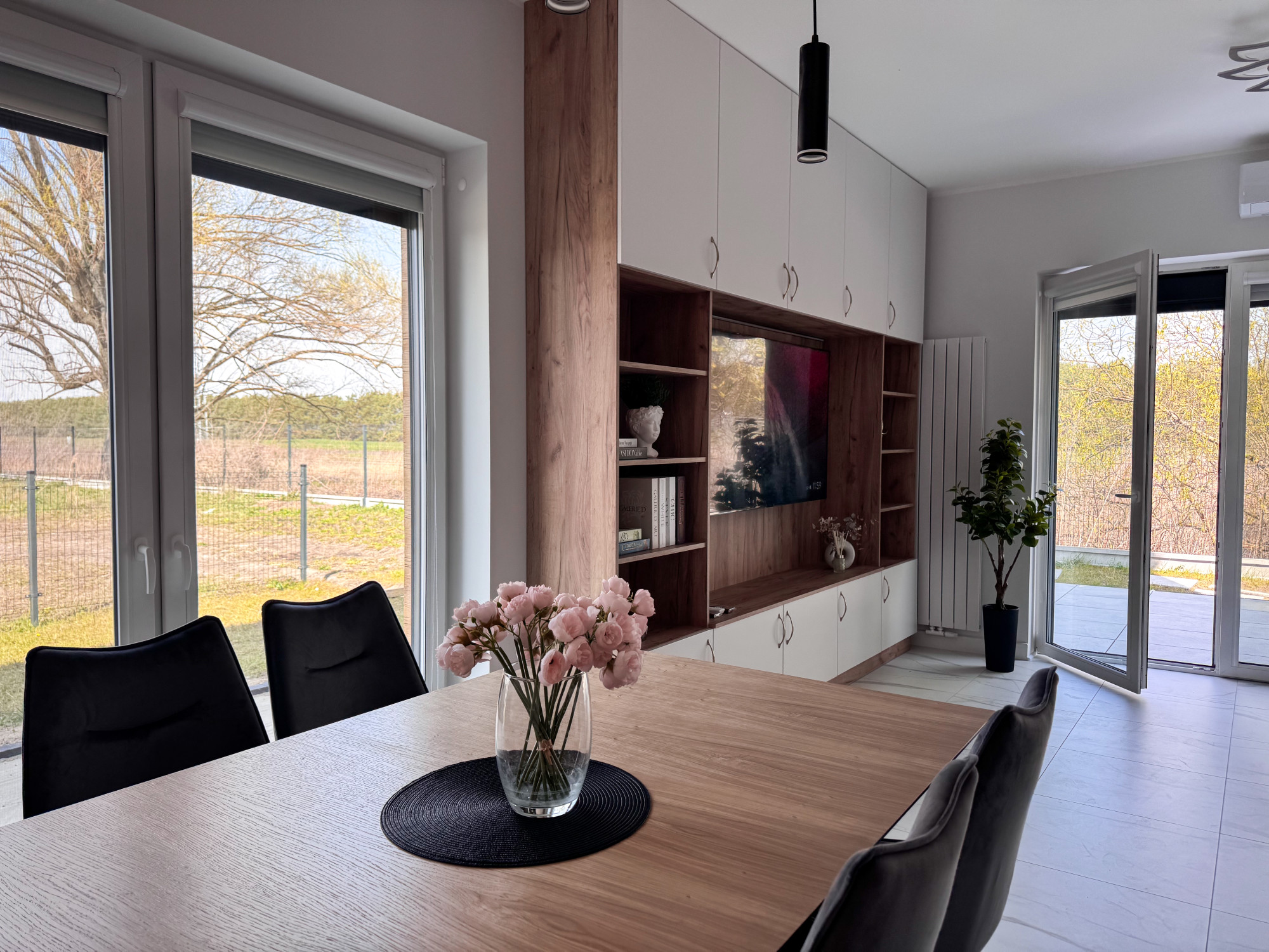 - Przestronny salon z jadalnią i wyjściem na taras oraz ogród.