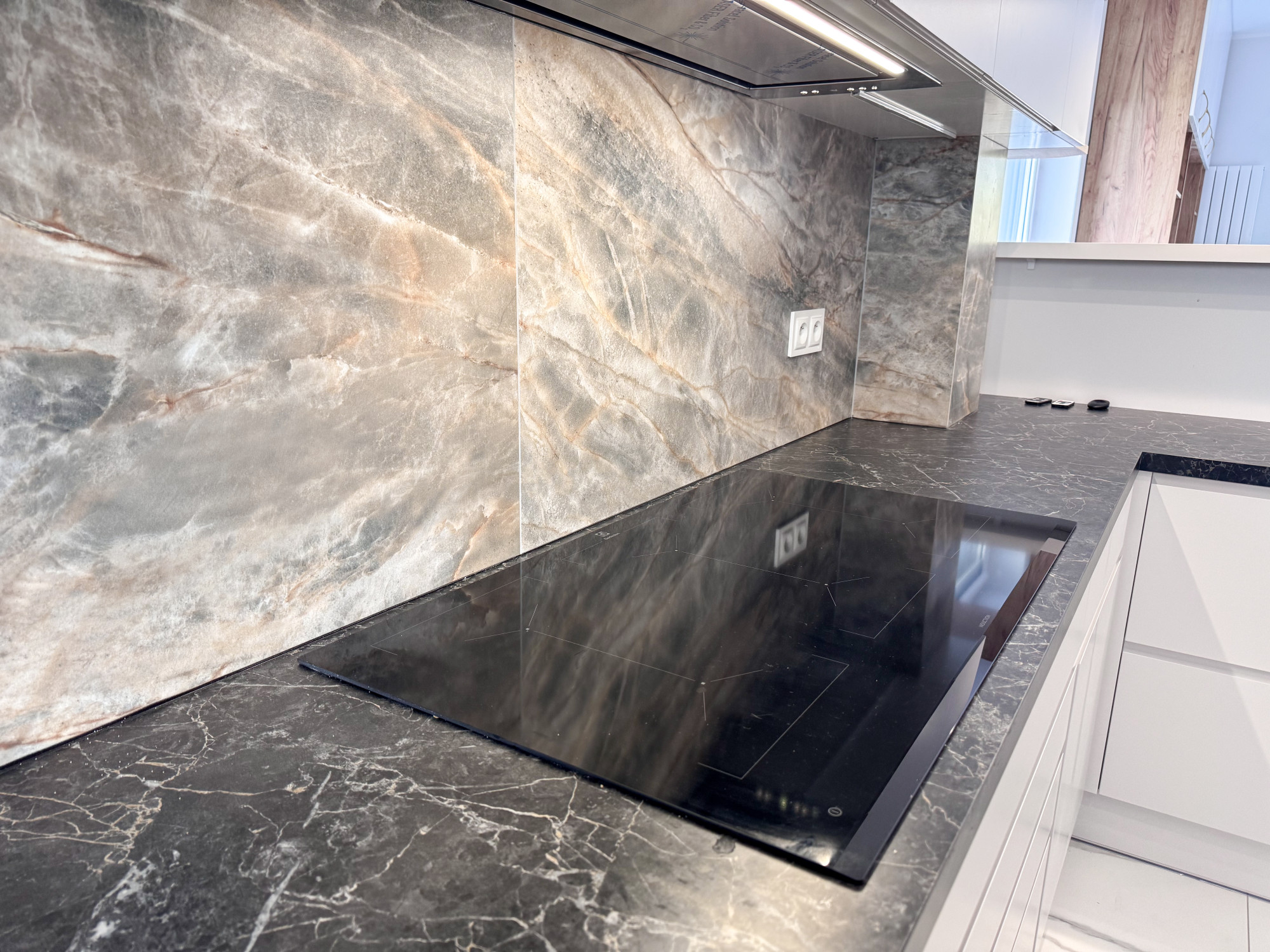 The kitchen is equipped with modern household appliances: Samsung side by side refrigerator with ice maker, large induction hob, dishwasher, designer sink.