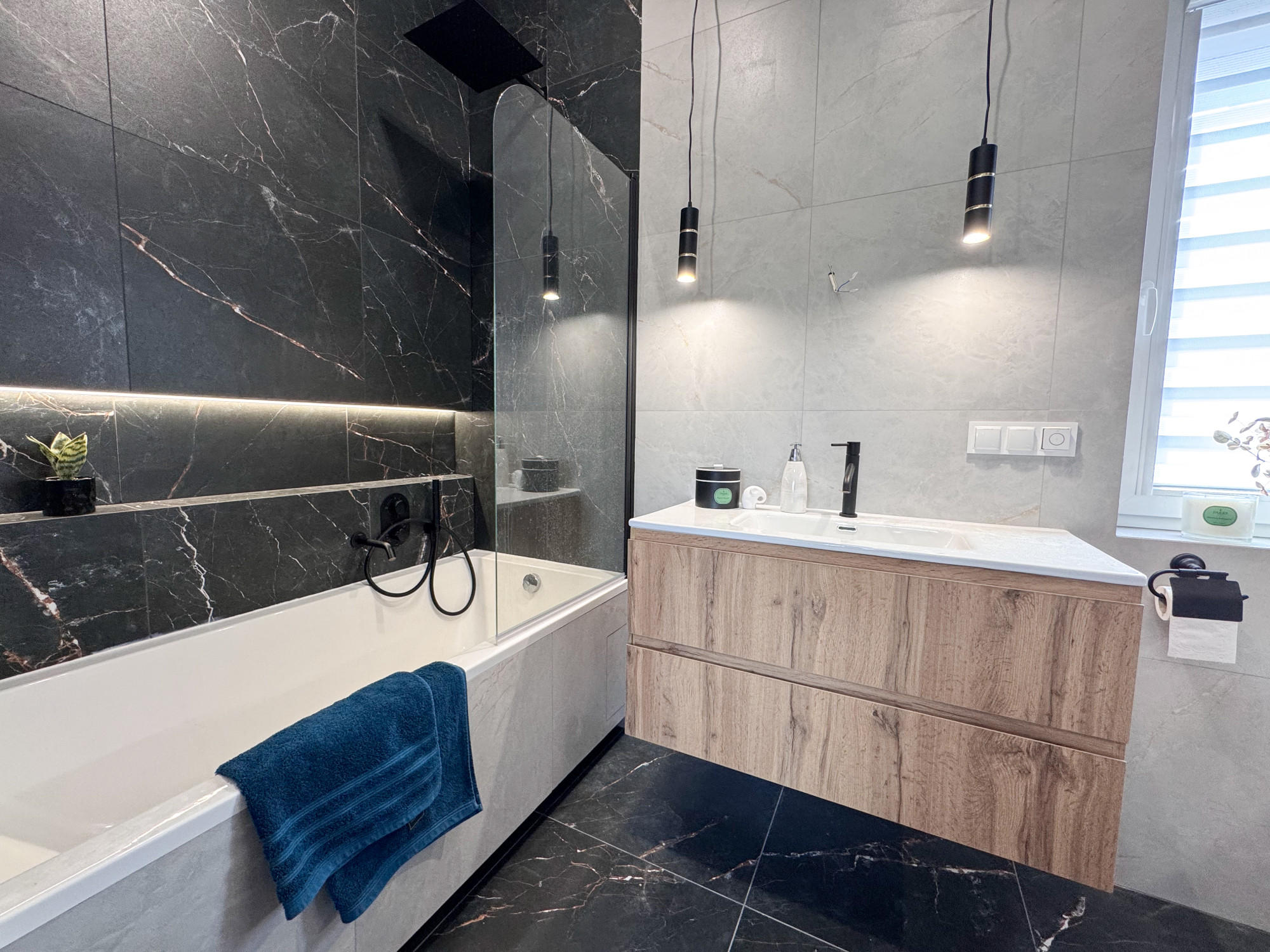 - Sypialnia Master z prywatną łazienką (wanna) i garderobą.