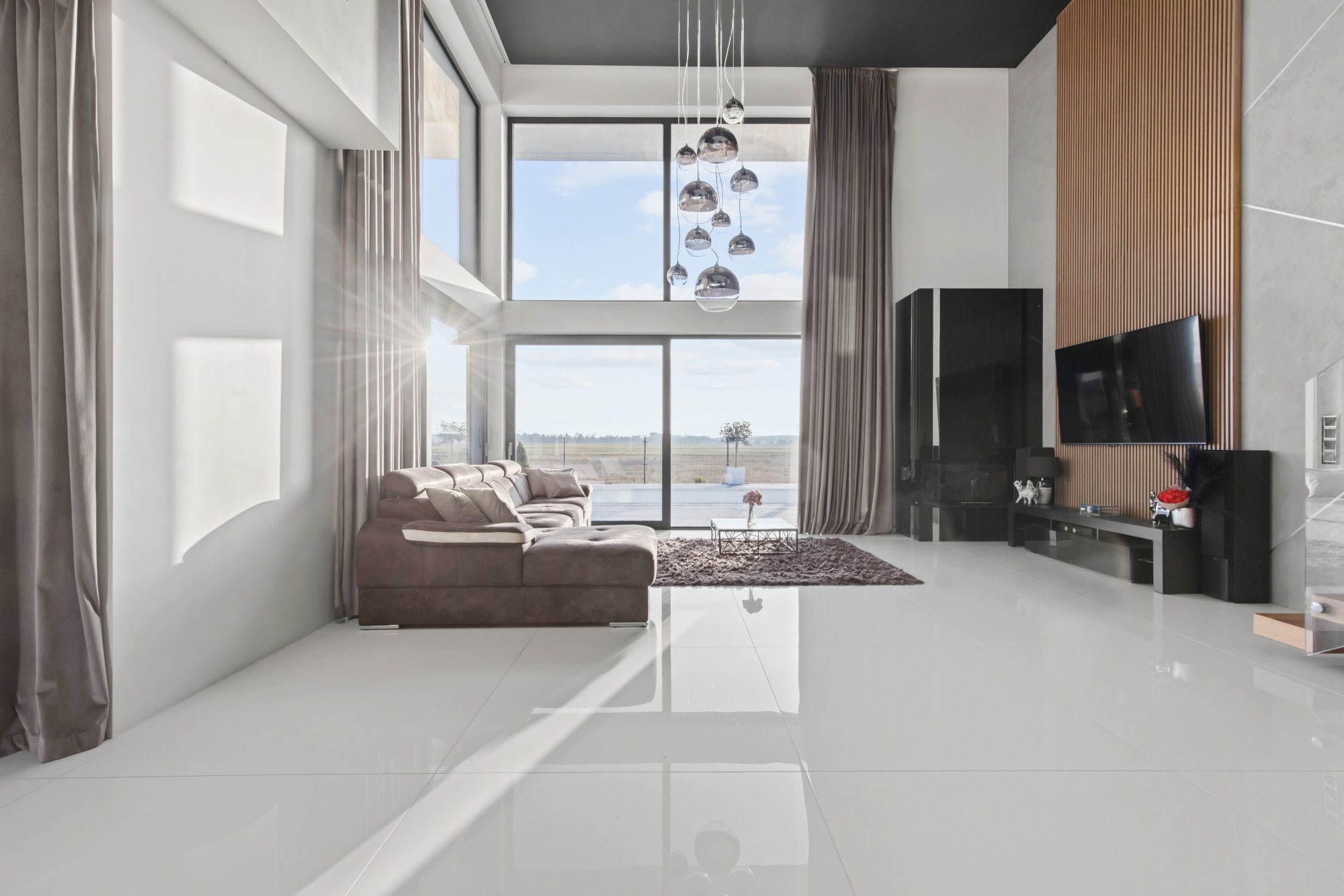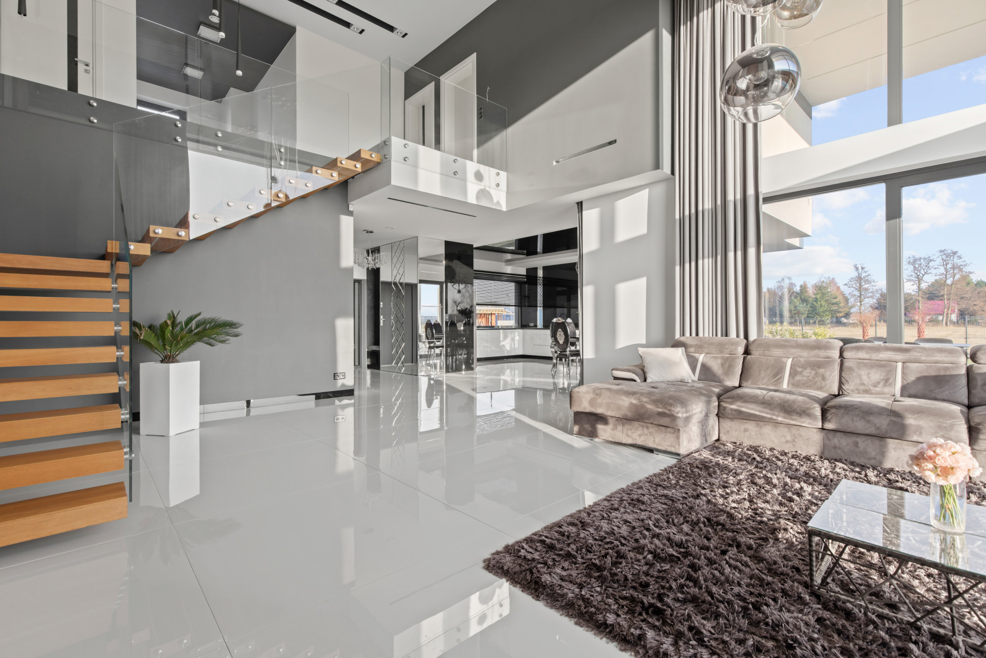 Spacious living room (30 m²) with a double-height glass wall and a fireplace.