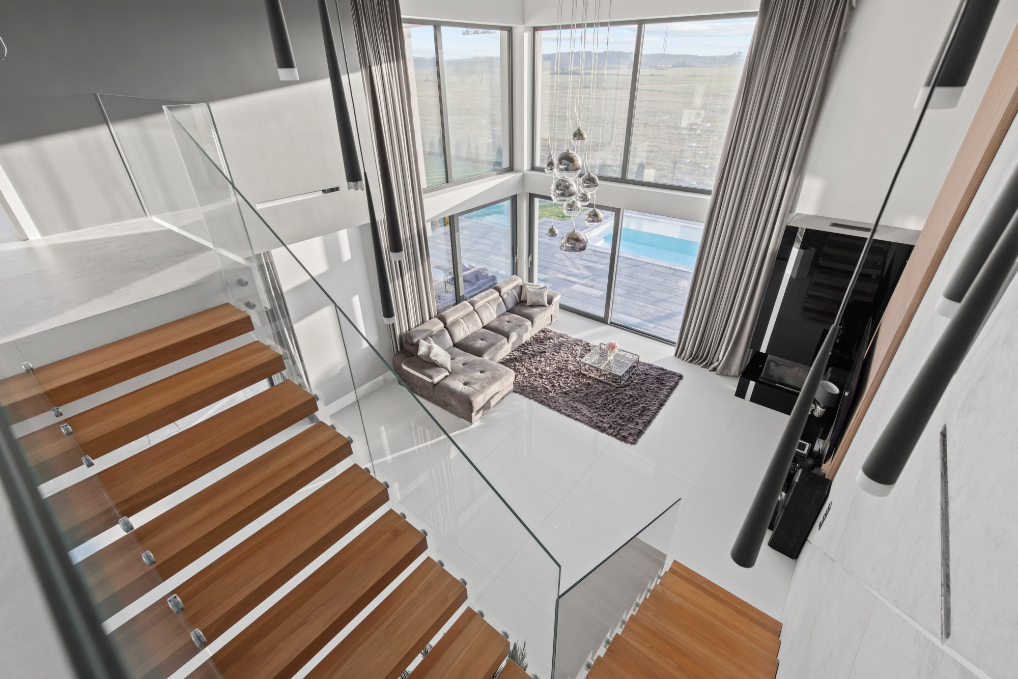 - Efektowne dębowe schody „lewitujące” ze szklaną balustradą.