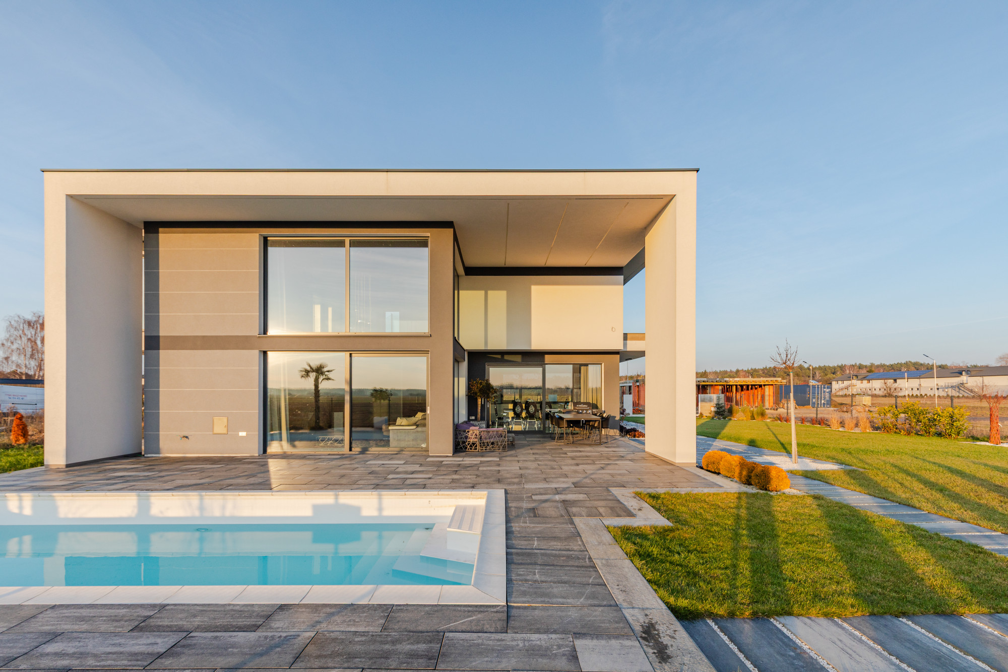 Rezydencja o powierzchni 255 m2, położona na działce 1176 m2, została zaprojektowana z myślą o wysokim standardzie i wygodzie domowników. Oferuje przestronne, dobrze doświetlone wnętrza, funkcjonalny układ pomieszczeń oraz solidne wykonanie z wysokiej jakości materiałów. Wysokość sufitu w salonie to ok. 6,5 m, co dodaje dodatkowej przestrzeni w domu. Duże przeszklenia otwierają widok na ogród, a elegancka architektura podkreśla reprezentacyjny charakter domu.W ogrodzie znajduje się kamienny, przestronny taras oraz nowoczesny basen ogrzewany pompą ciepła. Całość tworzy spójny i luksusowy projekt dla wymagających klientów.