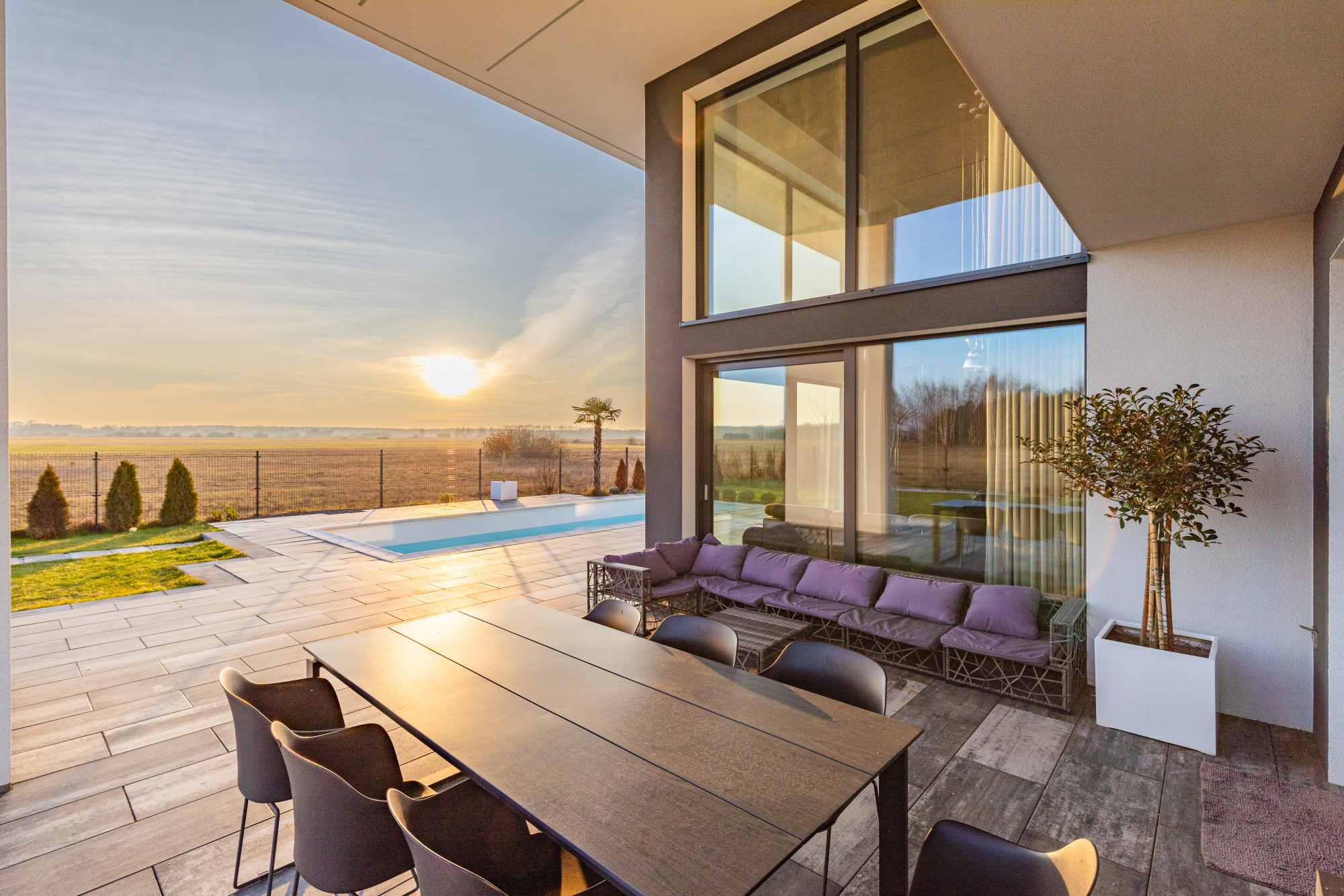 This 255 m² residence, situated on a 1,176 m² plot, has been designed with a focus on high standards and everyday comfort. It offers spacious, bright interiors, a functional layout, and high-quality materials throughout. The living room features an impressive ceiling height of approx. 6.5 m, adding a sense of openness. Large glazing provides a beautiful view of the garden, while the elegant architecture emphasizes the representative character of the home. The garden includes a stone terrace and a modern swimming pool heated by a heat pump. Altogether, it forms a coherent and luxurious project for demanding clients.