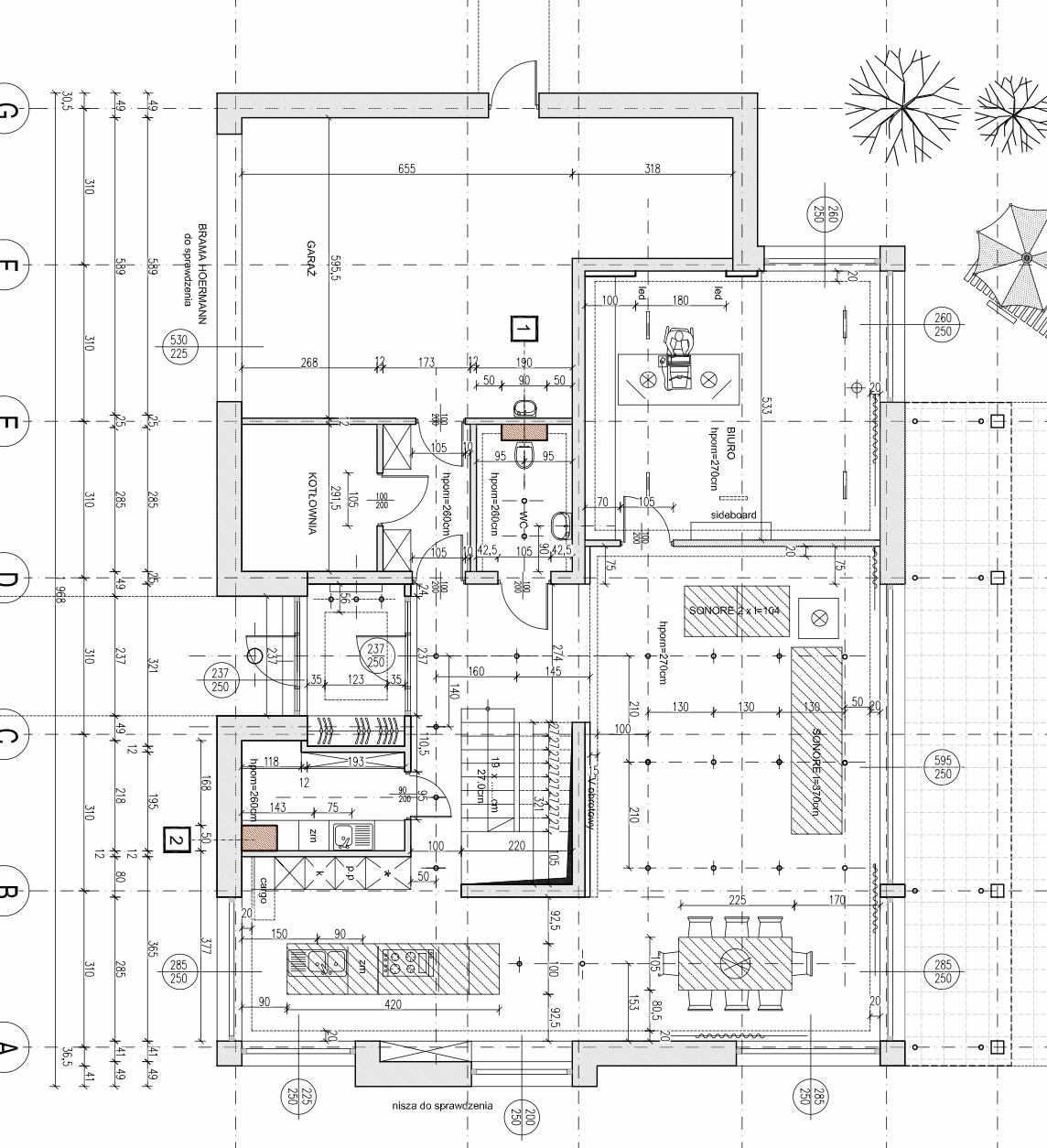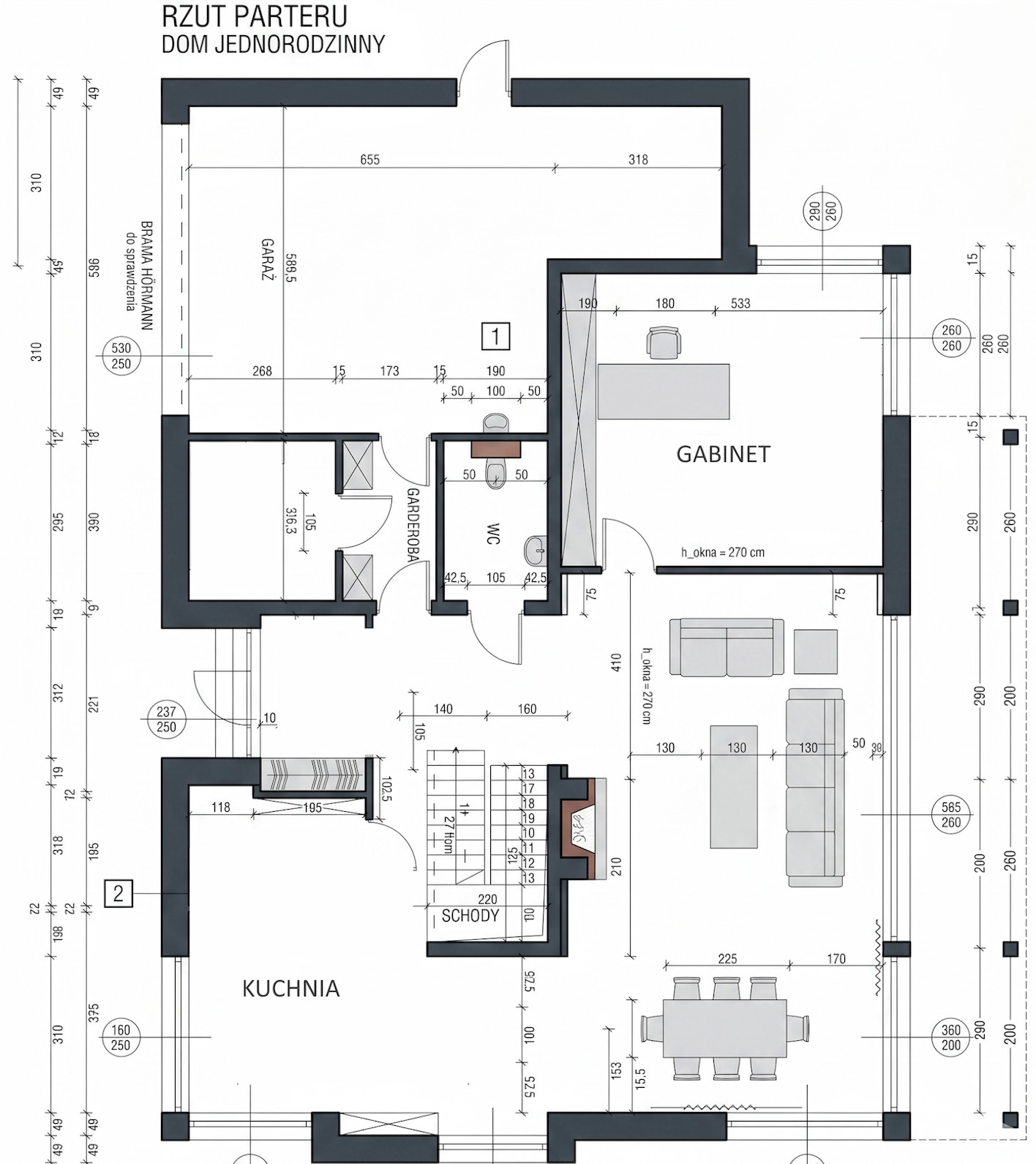 Parter to przestrzeń zaprojektowana z dbałością o każdy detal. Znajduje się tu przestronny salon z jadalnią, idealny do rodzinnych spotkań, a taras stanowi naturalne przedłużenie strefy dziennej, kuchnia, łazienka, gabinet oraz przejście bezpośrednio do dwustanowiskowego garażu z wygodnym holem oraz pomieszczenie gospodarczo techniczne.
