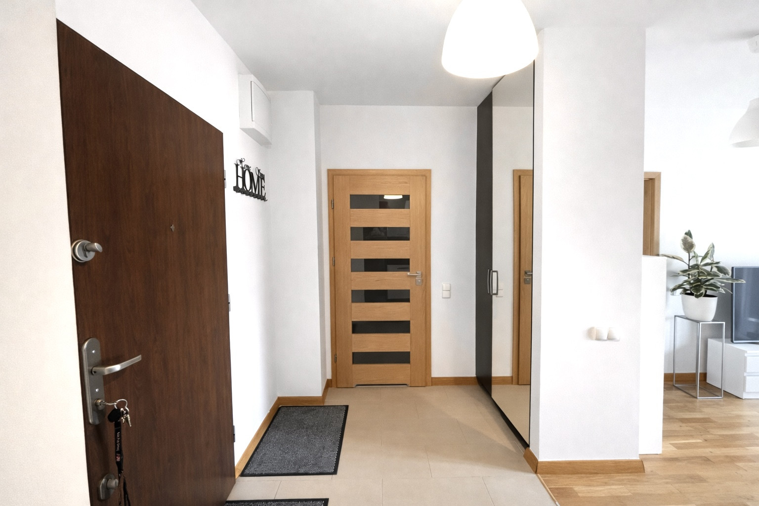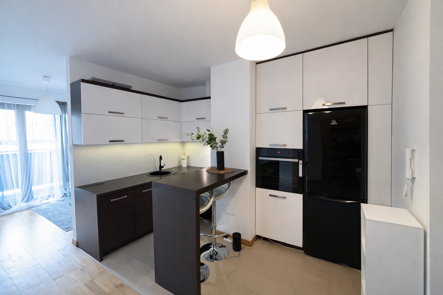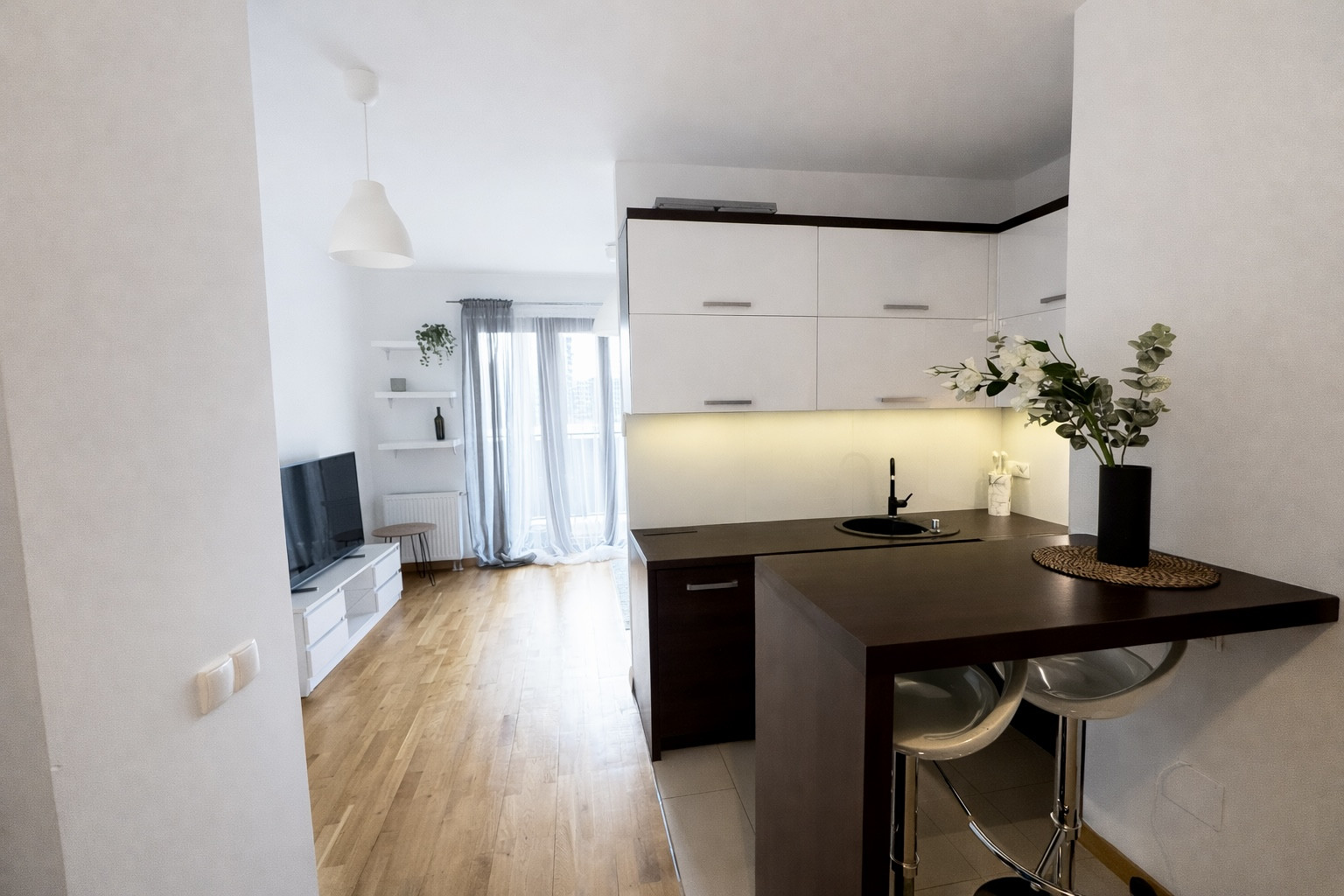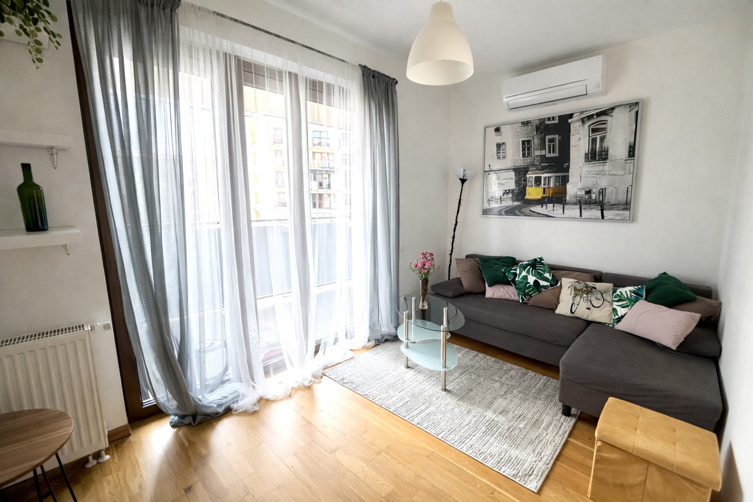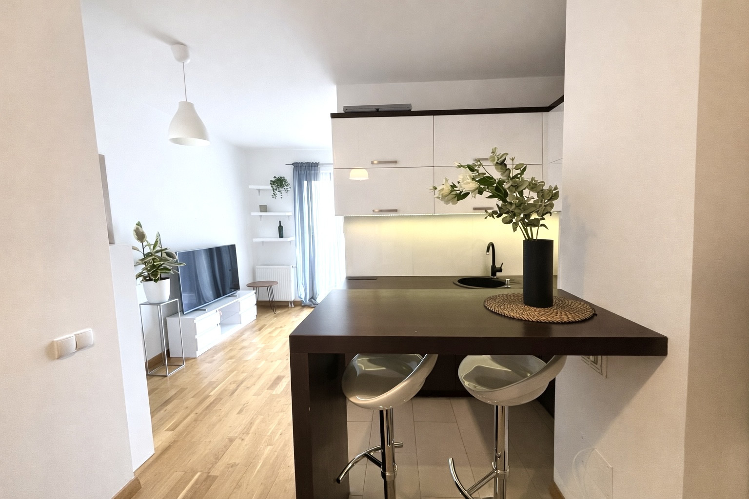PROPERTY DESCRIPTIONThis 41,25 m² apartment has been designed with maximum comfort and functionality in mind. The heart of the home is a cozy living room with direct access to an unusually large, fully furnished balcony. This space serves as a natural extension of the living area; thanks to the lounge set, it becomes an ideal spot for morning coffee or reading a book on warm afternoons.