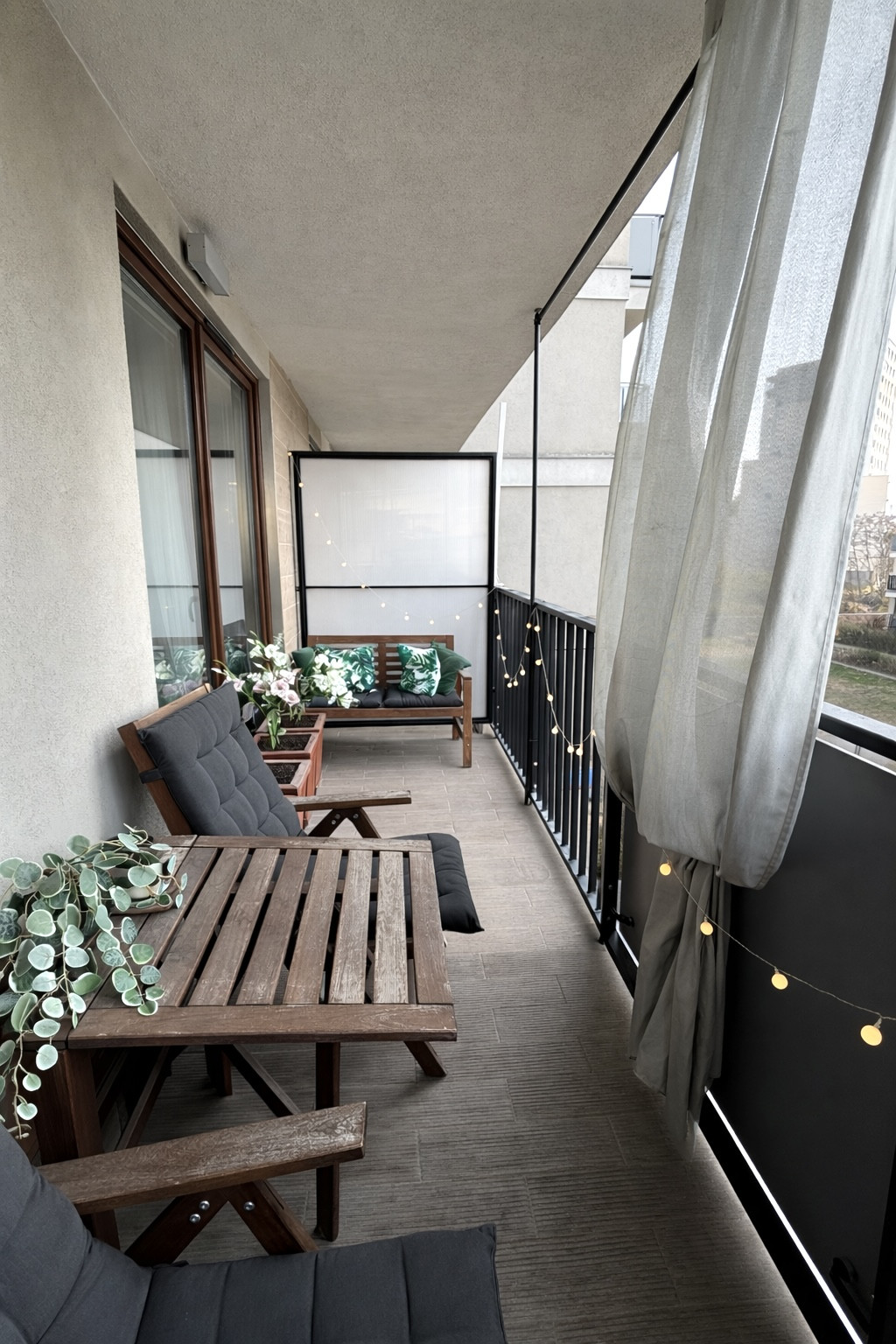 wyjątkowo duży, w pełni umeblowany balkon. To naturalne przedłużenie strefy dziennej, które dzięki kompletowi wypoczynkowemu staje się idealnym miejscem na poranną kawę czy lekturę książki w ciepłe popołudnia.