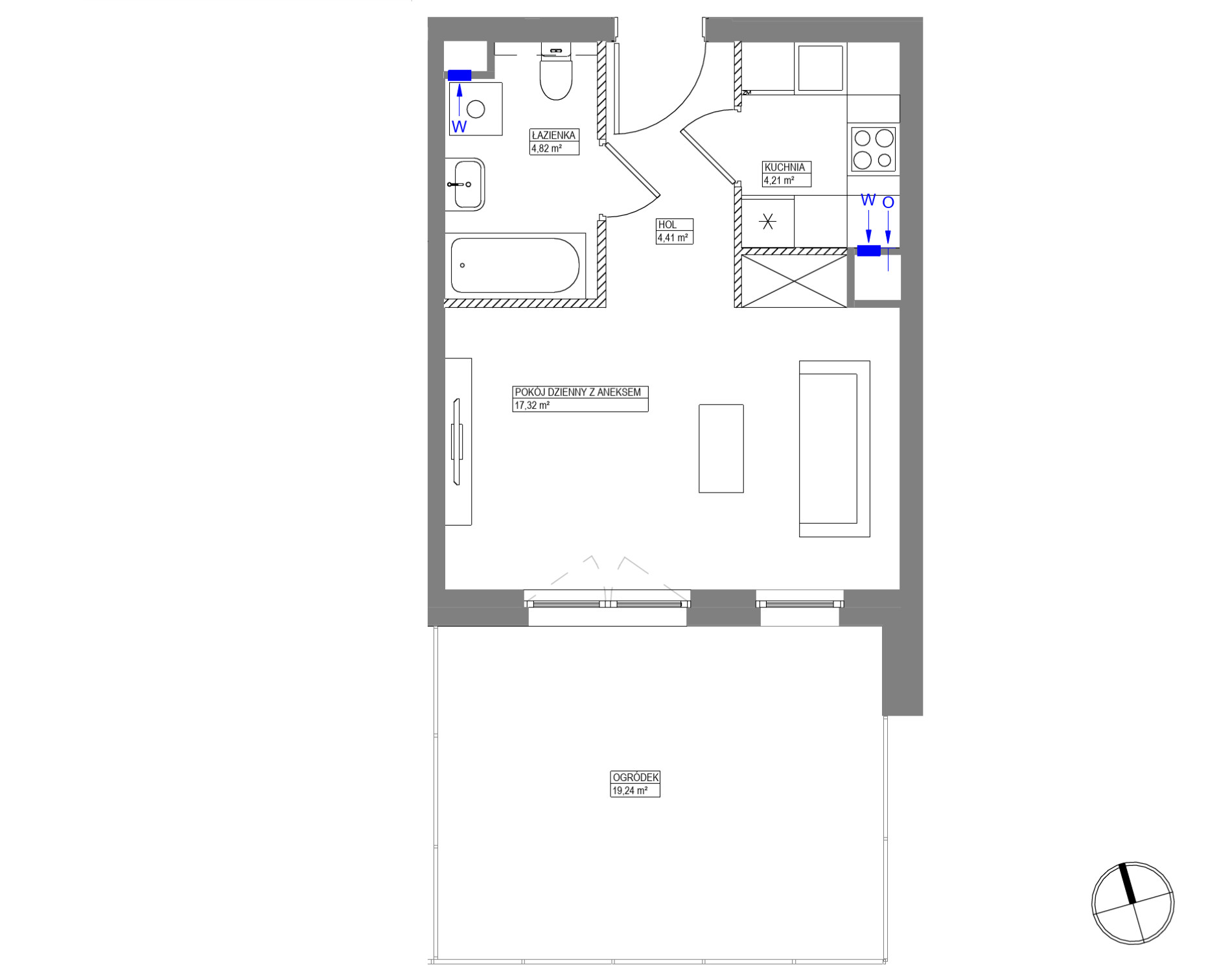 - pokój dzienny z aneksem 17,32 m2