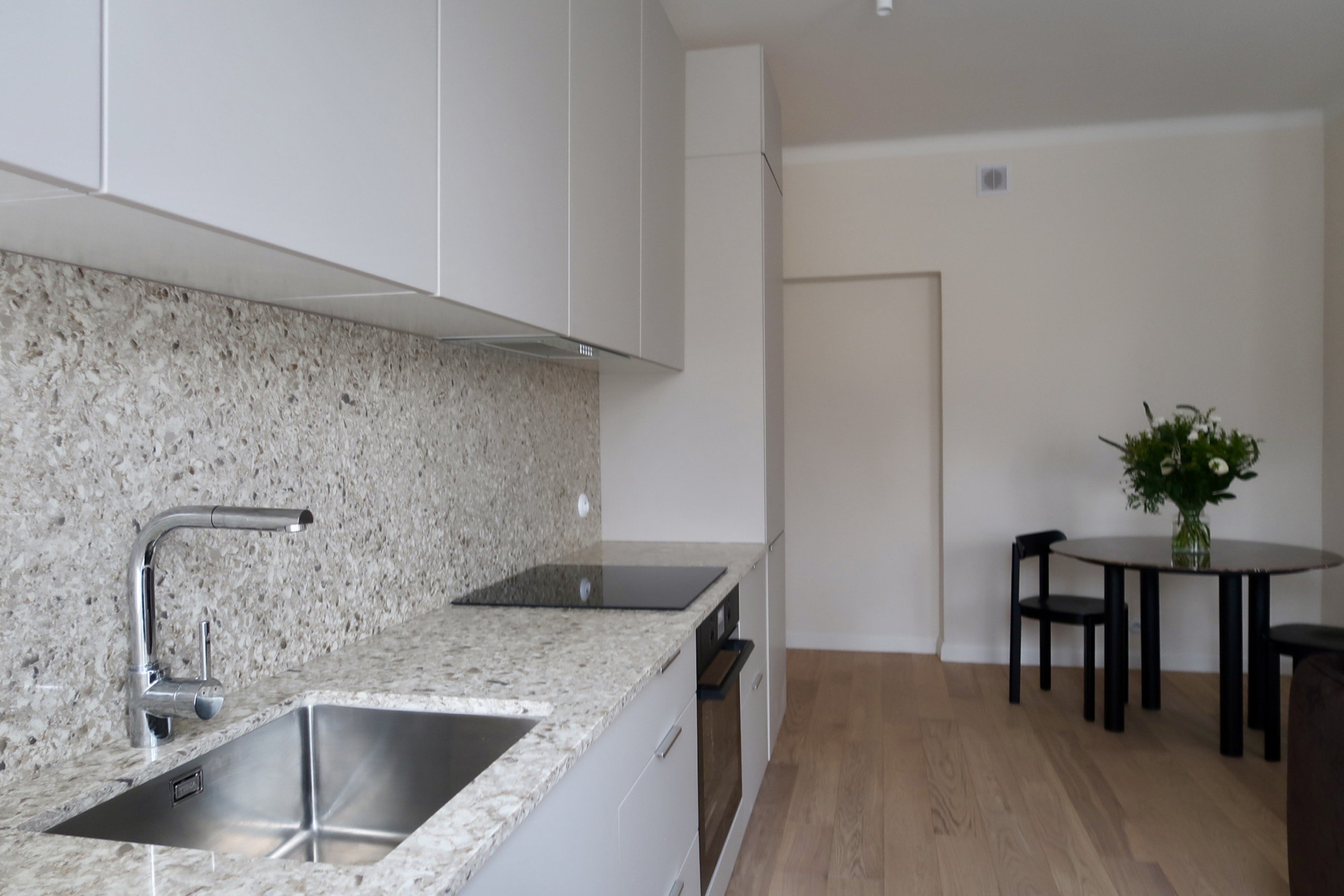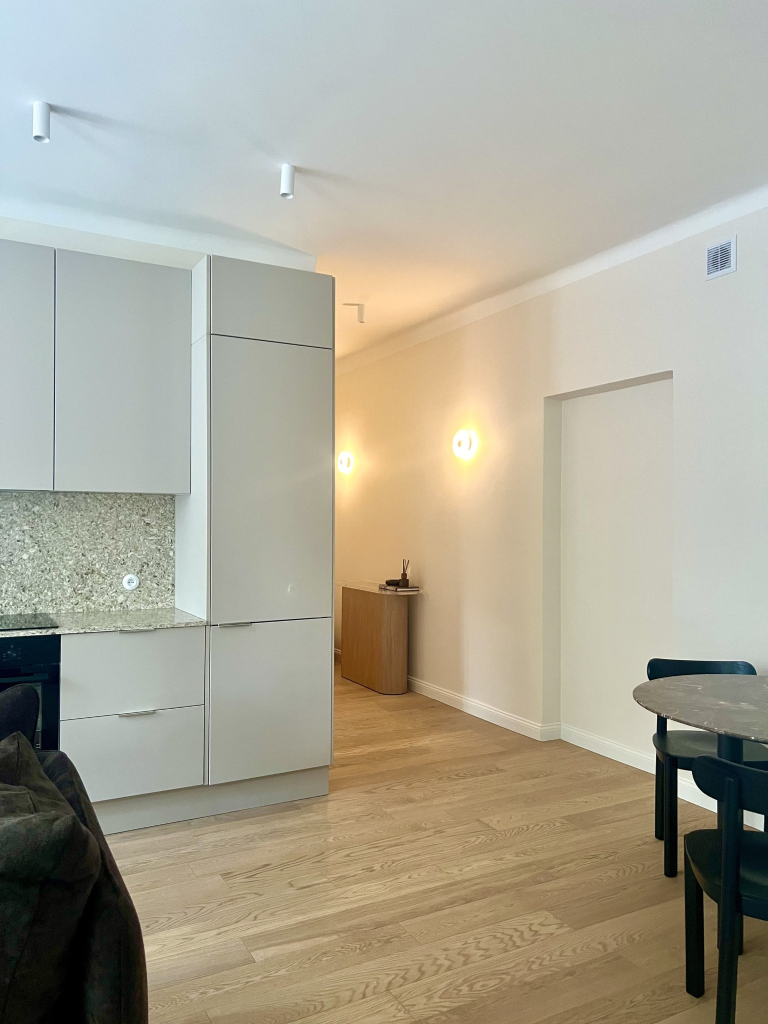 Natural oak flooring has been used throughout the apartment, while the bathroom features elegant ceramic tiles. The kitchen is fitted with a quartz composite countertop, combining aesthetics with durability. Household appliances come from renowned brands such as Bosch, Siemens, Electrolux, and Haier.