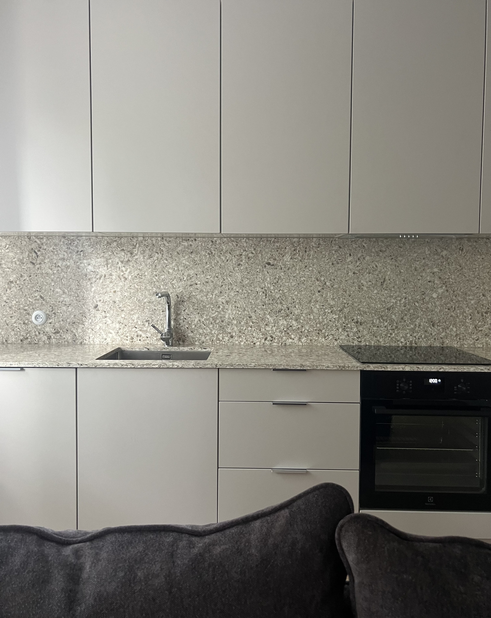 Na podłogach zastosowano naturalny dąb, a w łazience eleganckie płytki ceramiczne. Kuchnia wyposażona jest w blat z konglomeratu kwarcowego, łączący estetykę z wysoką trwałością. Sprzęt AGD pochodzi od renomowanych producentów: Bosch, Siemens, Electrolux oraz Haier.