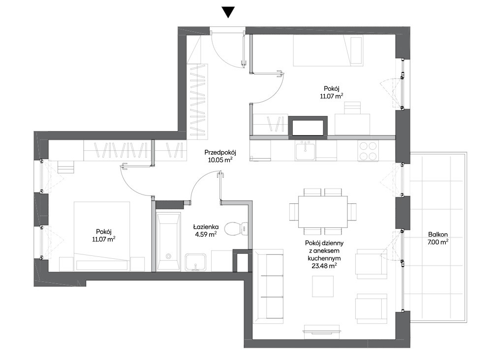 ROZKŁAD POMIESZCZEŃ:- salon z aneksem kuchennym 23,48 m2