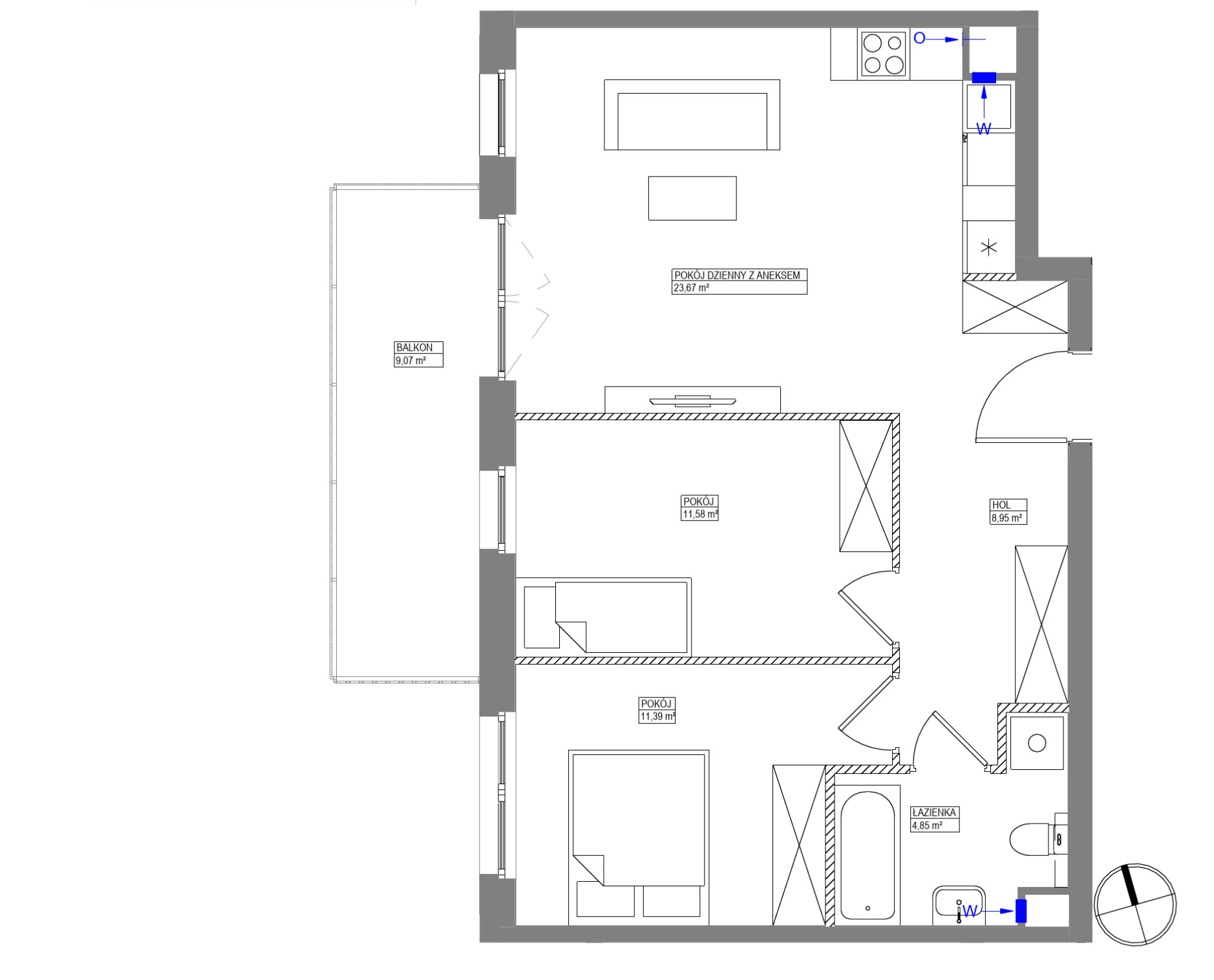 ROZKŁAD POMIESZCZEŃ- pokój dzienny z aneksem 23,67 m2