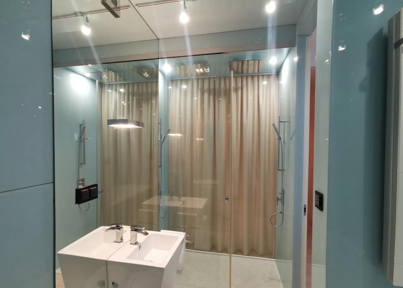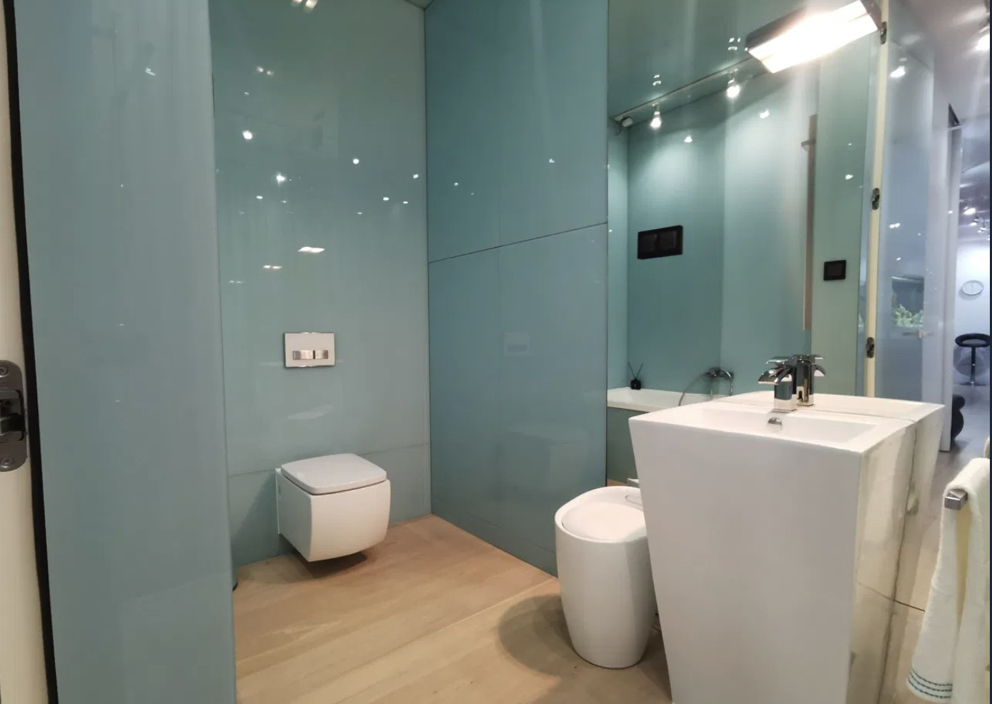 - Sypialnia 1 (11,5 m²) — szklana ściana przy łazience