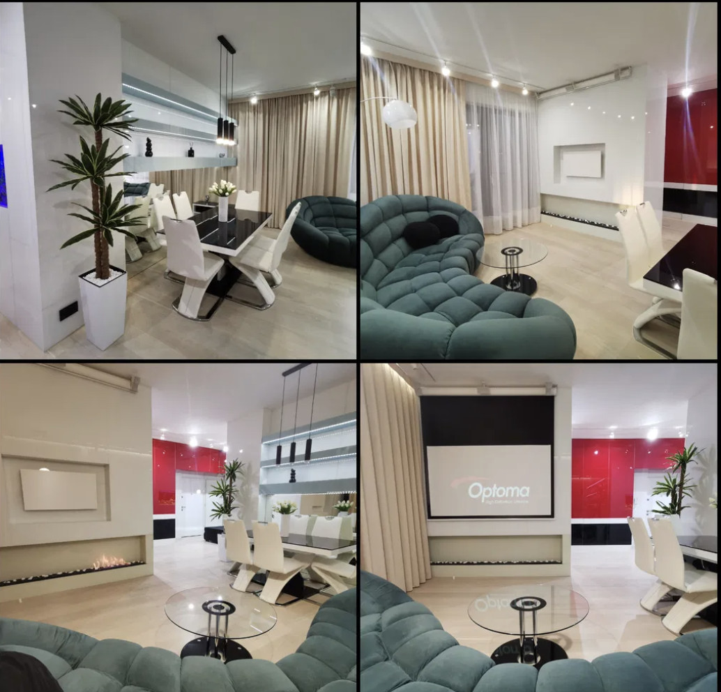 - Salon (20,5 m²) — loggia ok. 8 m², biokominek, kino domowe Bose + Marantz