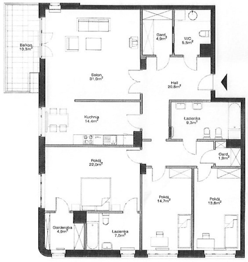 - Salon z kuchnią - 45,4 m² (salon 31 m² + kuchnia 14,4 m²) z wyjściem na balkon