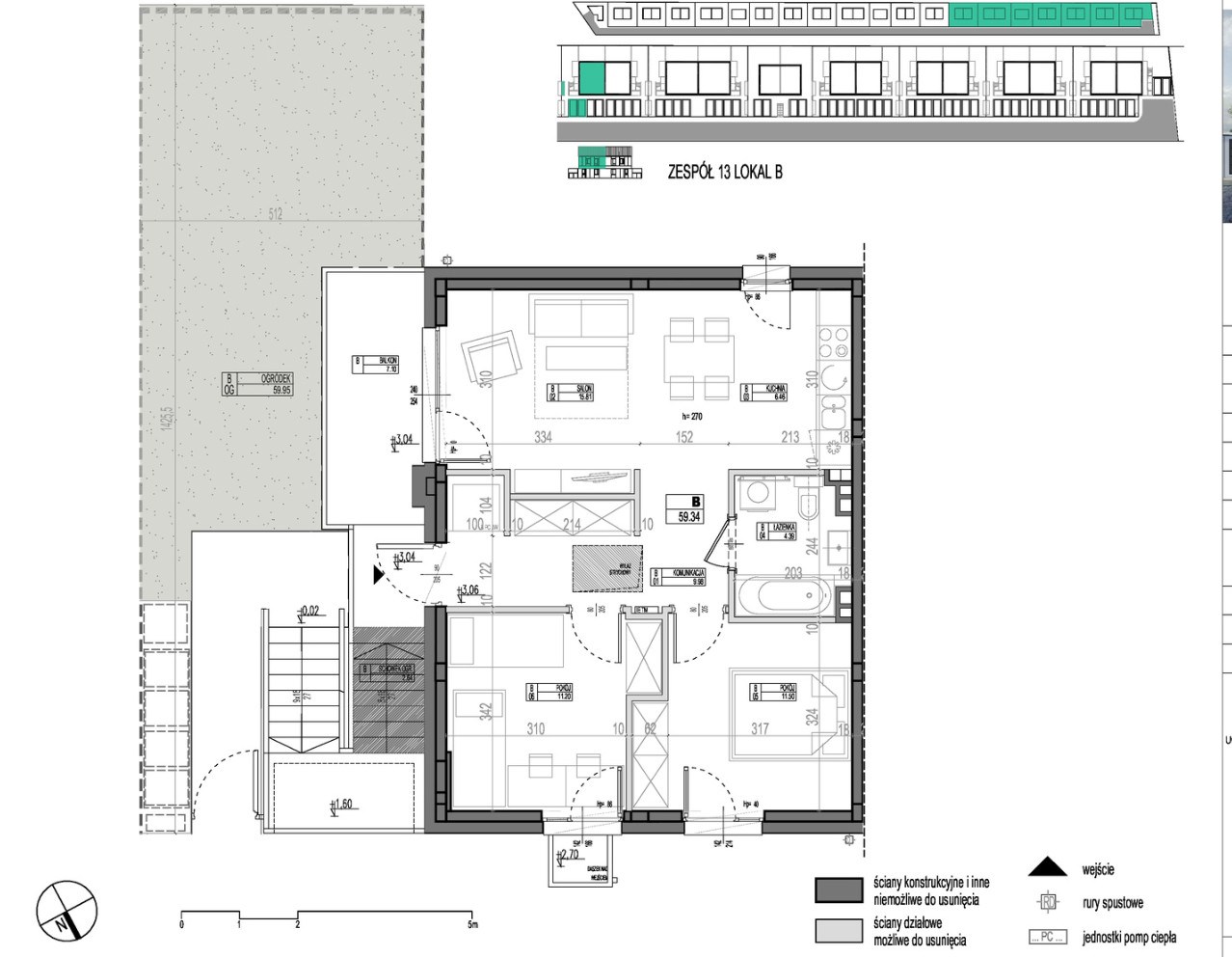 The premises with an area of 59.09 m2 have 3 rooms and a private garden of 34.30 m2.