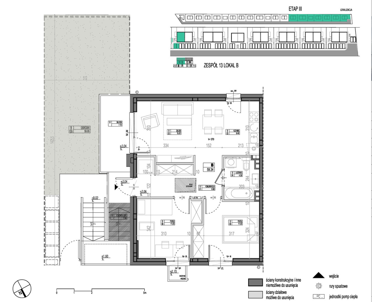 Lokal o powierzchni 59,96 m2 ma 3 pokoje i własny ogródek o powierzchni 59,96 m2.