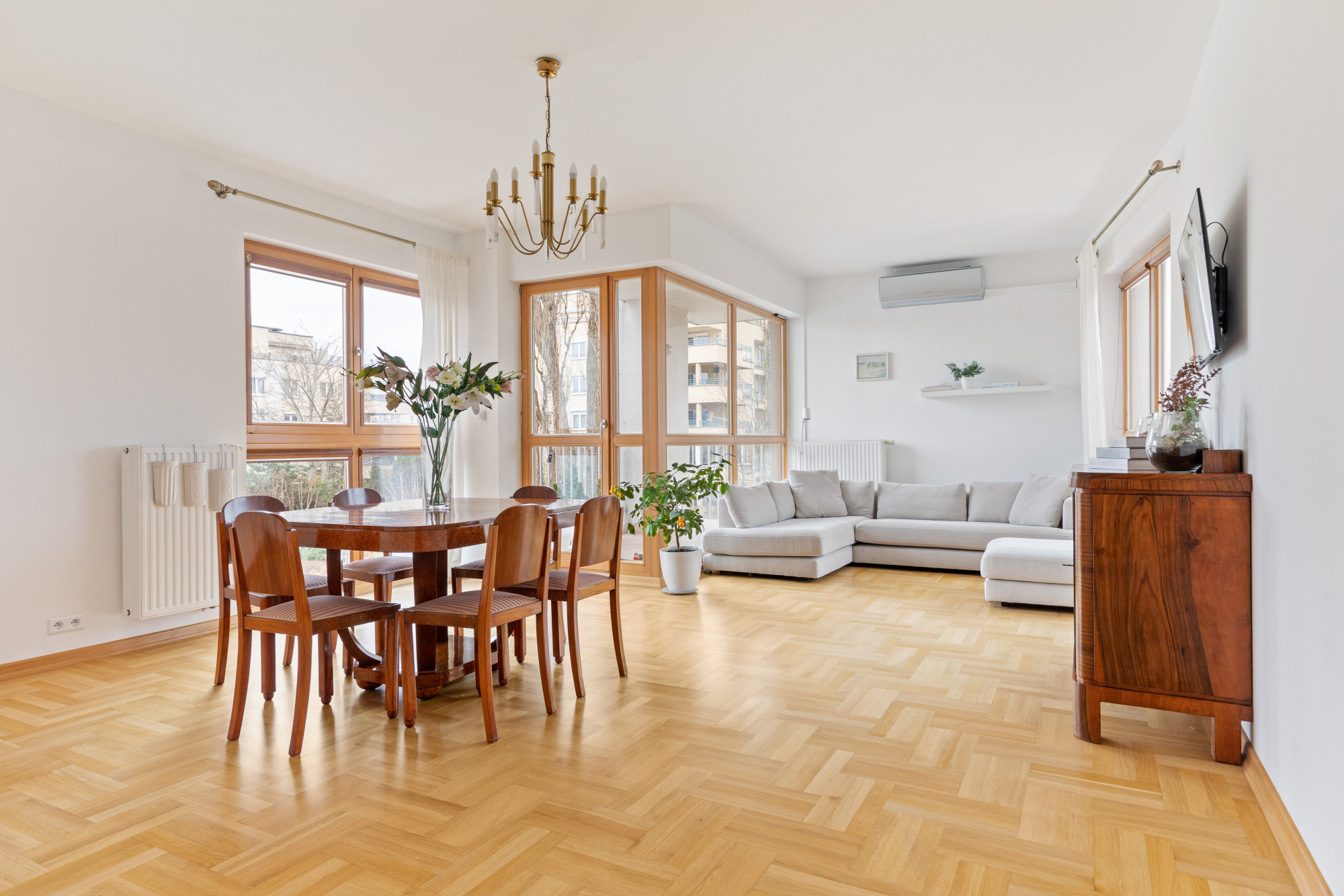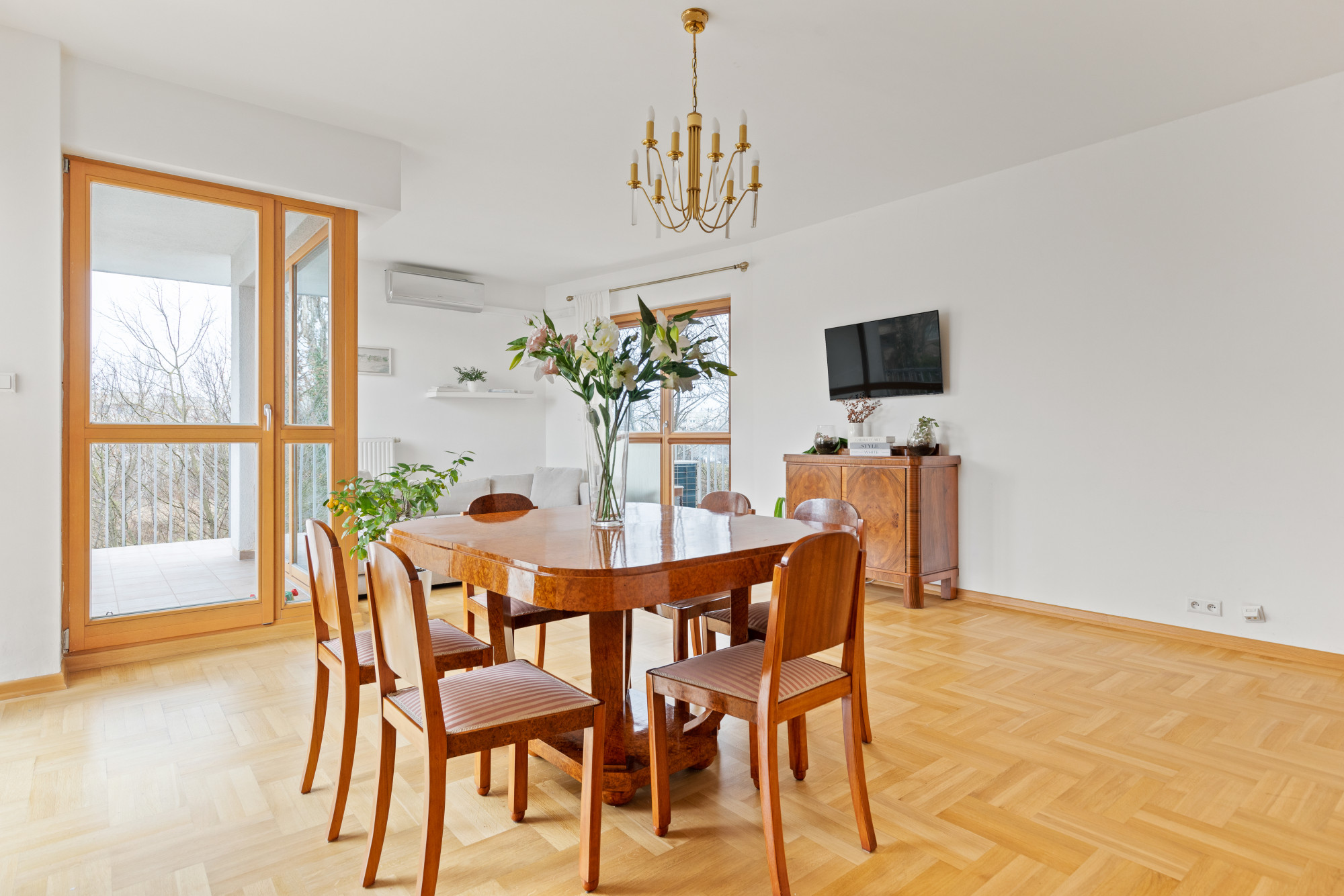 W salonie znajduje się klimatyzacja oraz wyjście na dwa balkony z widokiem na tereny zielone.