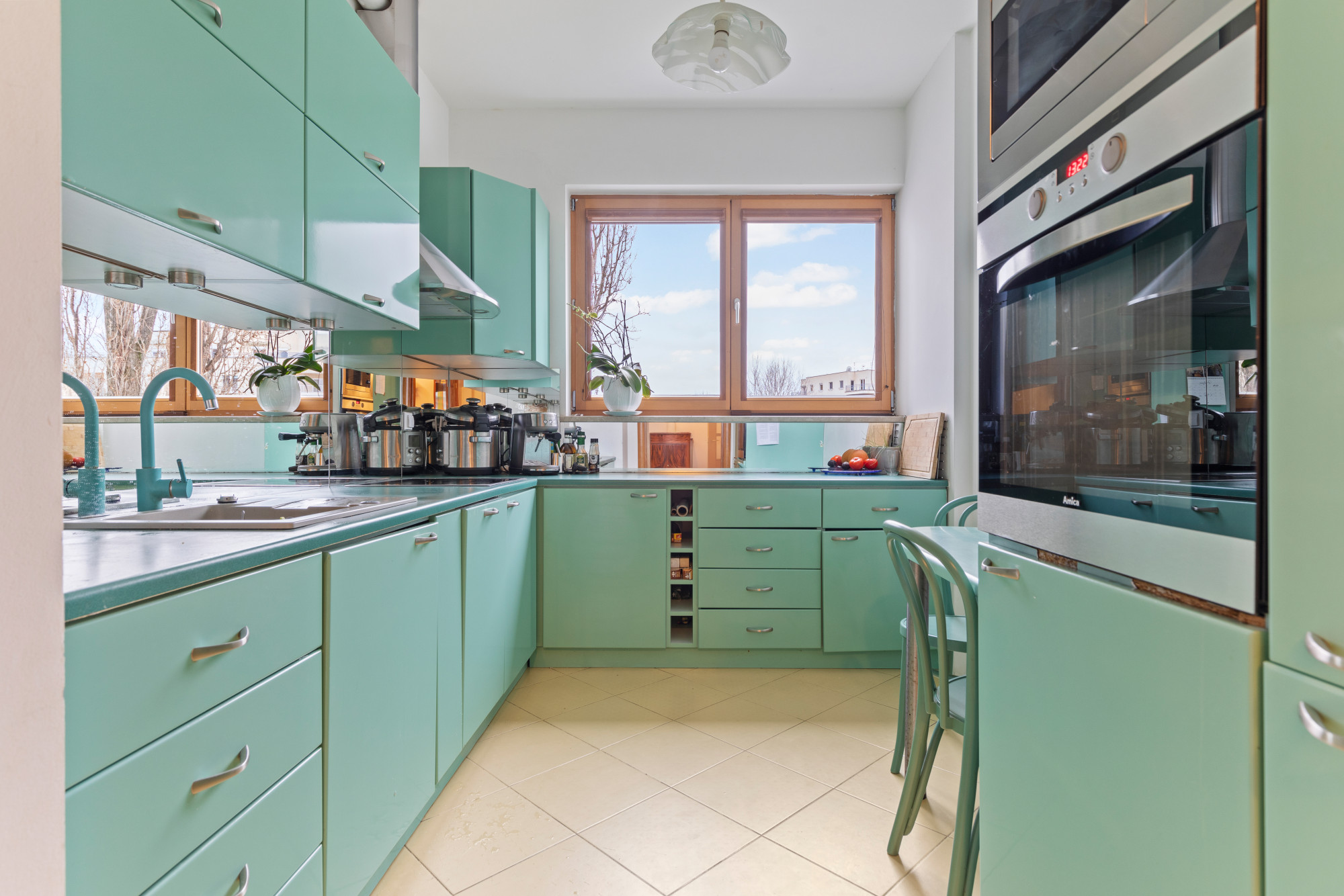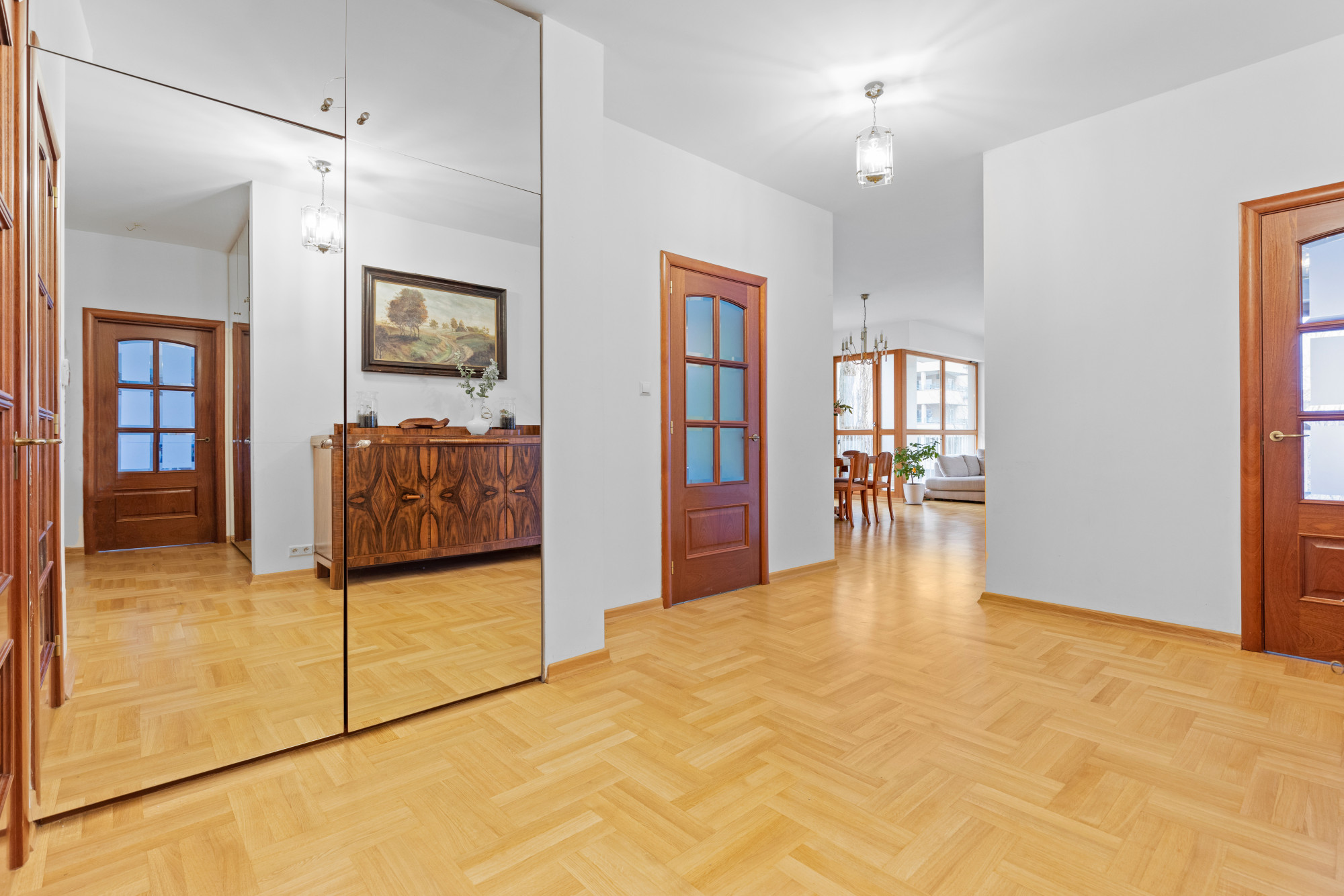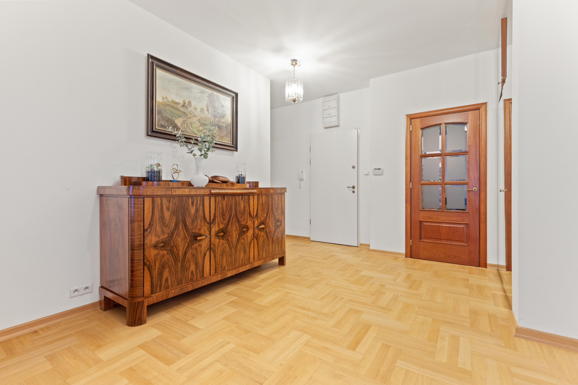 Wnętrze zostało wykończone w ciepłym, klasycznym stylu - jasna drewniana podłoga, duże drewniane okna i wysokie pomieszczenia tworzą harmonijną, przestronną atmosferę.
