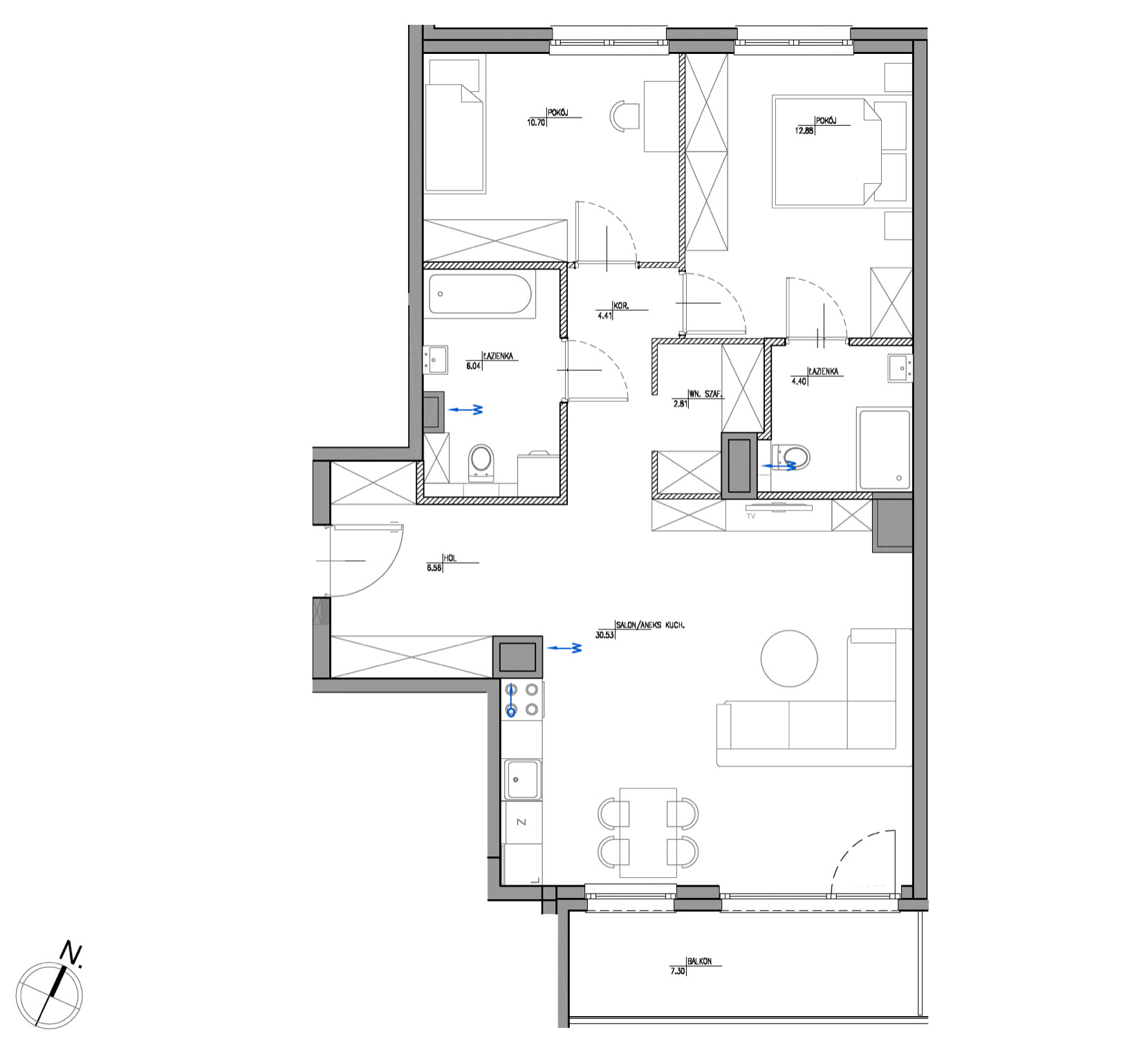 ROZKŁAD POMIESZCZEŃ:- salon z aneksem kuchennym 30,53 m2