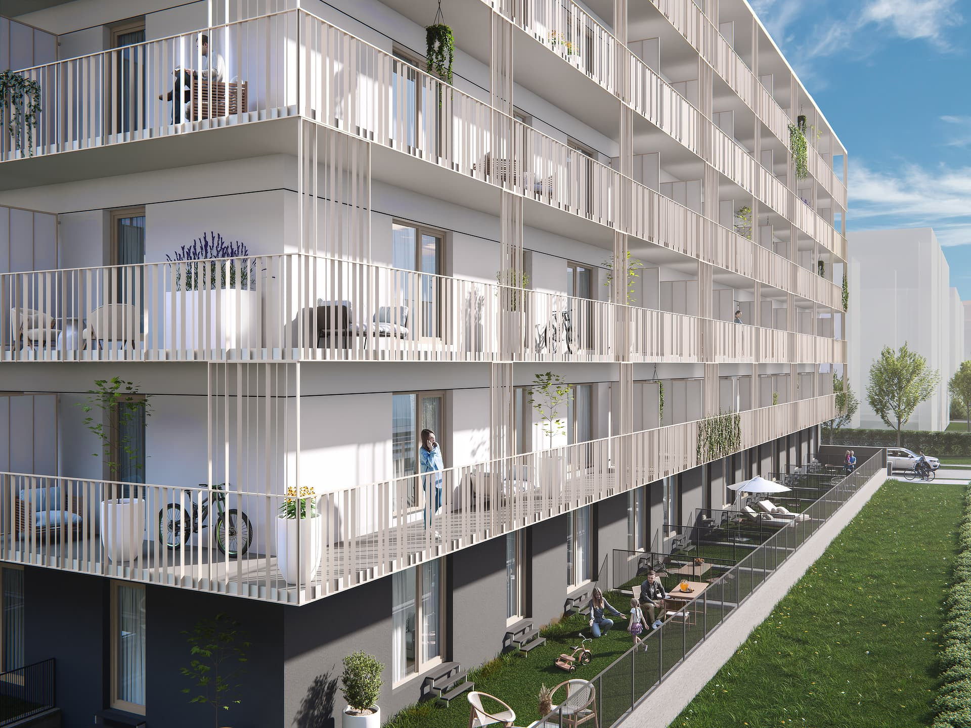 green courtyards with small architecture elements