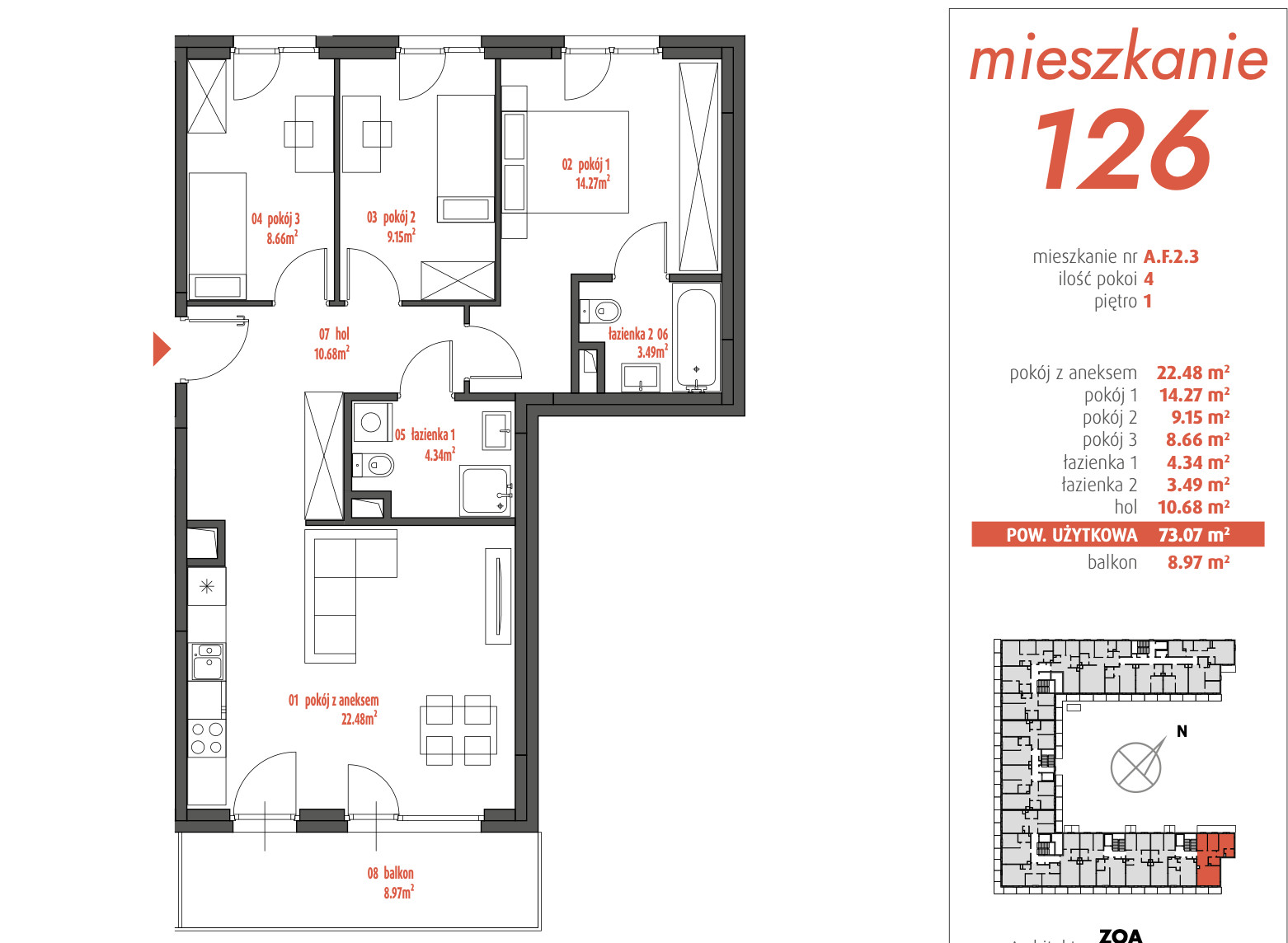 ROZKŁAD POMIESZCZEŃ:pokój z aneksem- 22,48 m2