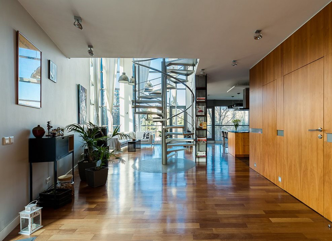 Wnętrze utrzymane jest w ponadczasowym stylu loftowym - eleganckim, przestronnym i pełnym naturalnego światła. Materiały wykończeniowe najwyższej jakości, z dbałością o każdy detal: dębowe podłogi, naturalny korek w łazience, przemyślane oświetlenie, meble na wymiar.