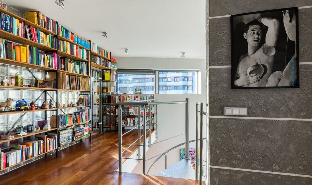 - antresola z regałami na książki i ukrytym dodatkowym pokojem,