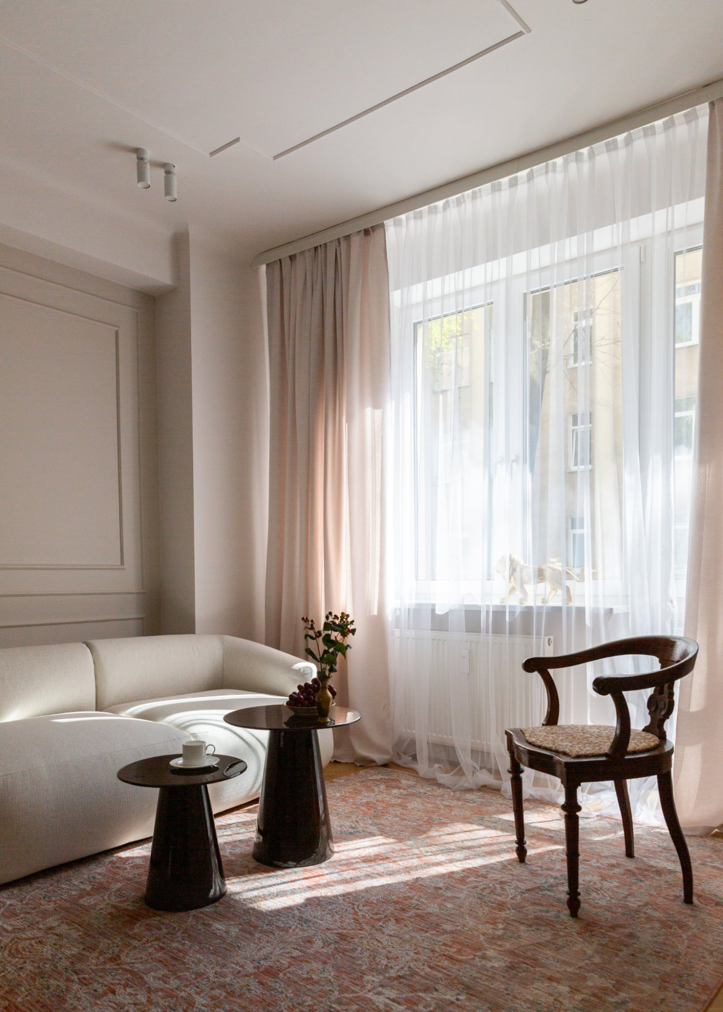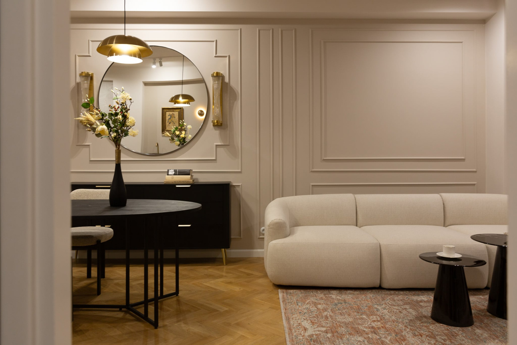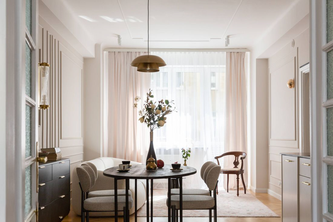 Wnętrze utrzymane jest w ciepłej, jasnej tonacji - z nutą przedwojennej elegancji i nowoczesnego minimalizmu.