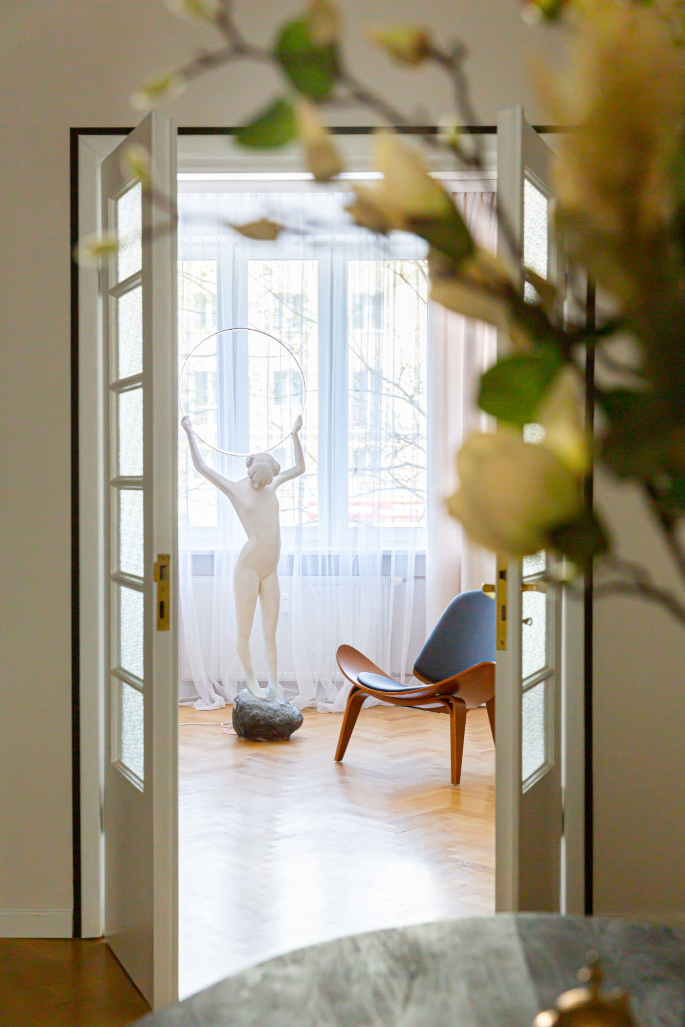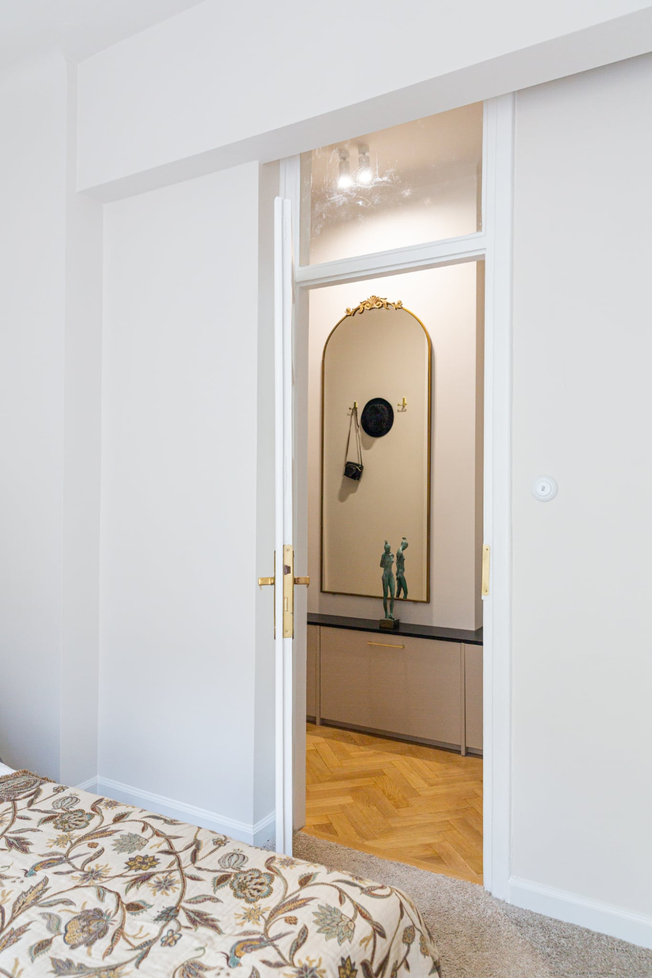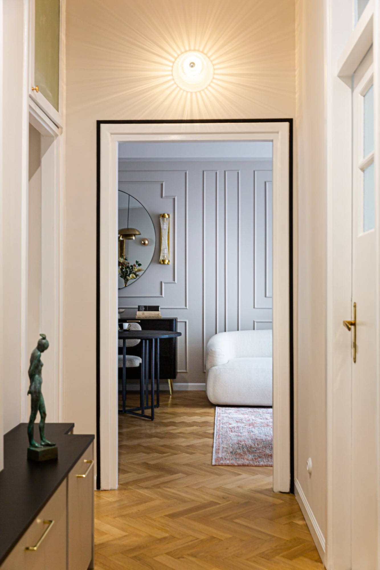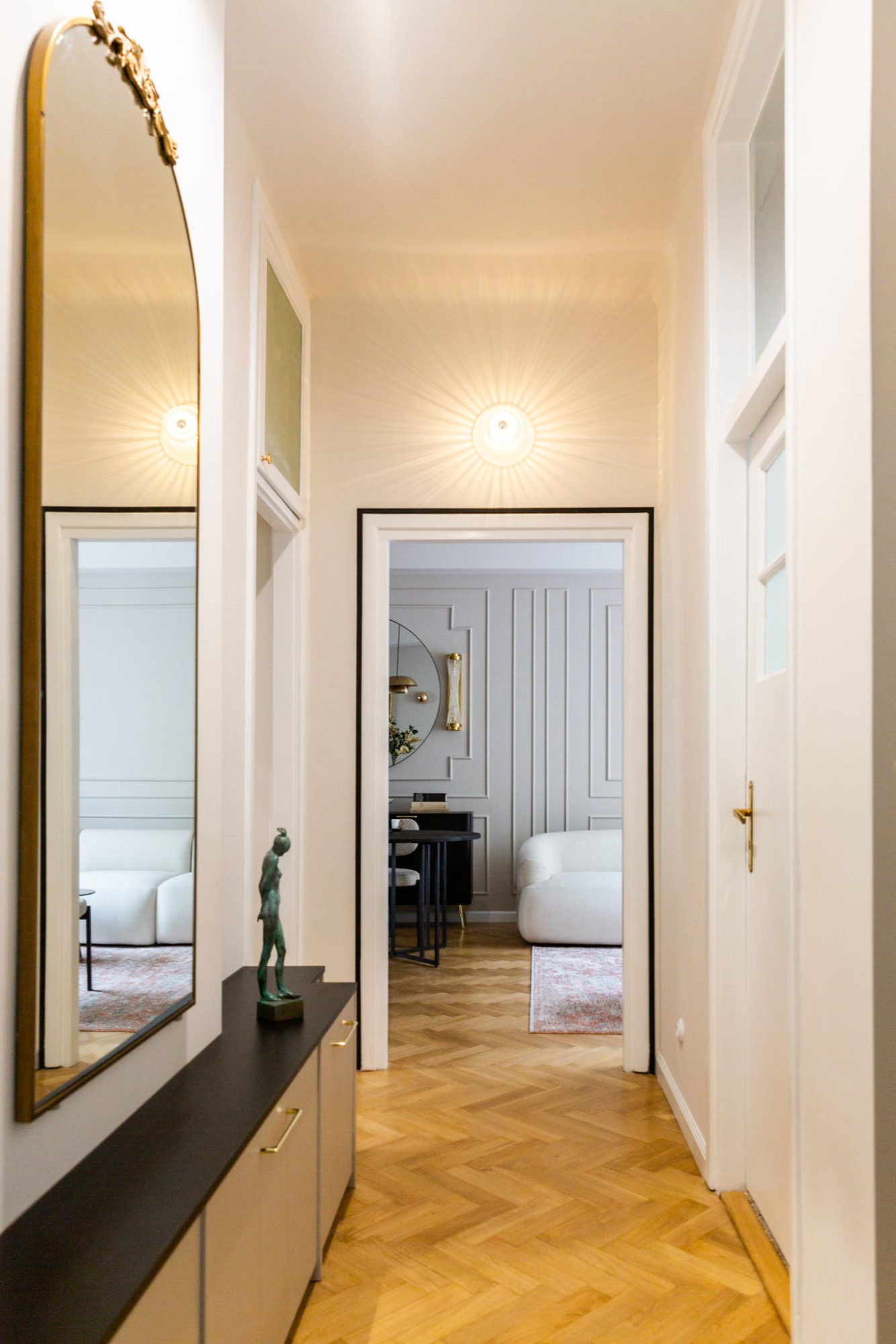 Odtworzone oryginalne drzwi i dębowy parkiet przypominają o historii tego miejsca, a jednocześnie idealnie współgrają z nowoczesnym oświetleniem i wyposażeniem.