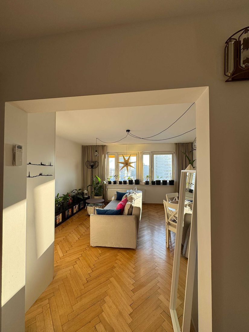 Mieszkanie zostało odświeżone i odmalowane w kwietniu 2025 roku. Jest dwustronne, bardzo dobrze doświetlone i wyposażone w klimatyzację w salonie. W całym mieszkaniu znajduje się elegancki dębowy parkiet.