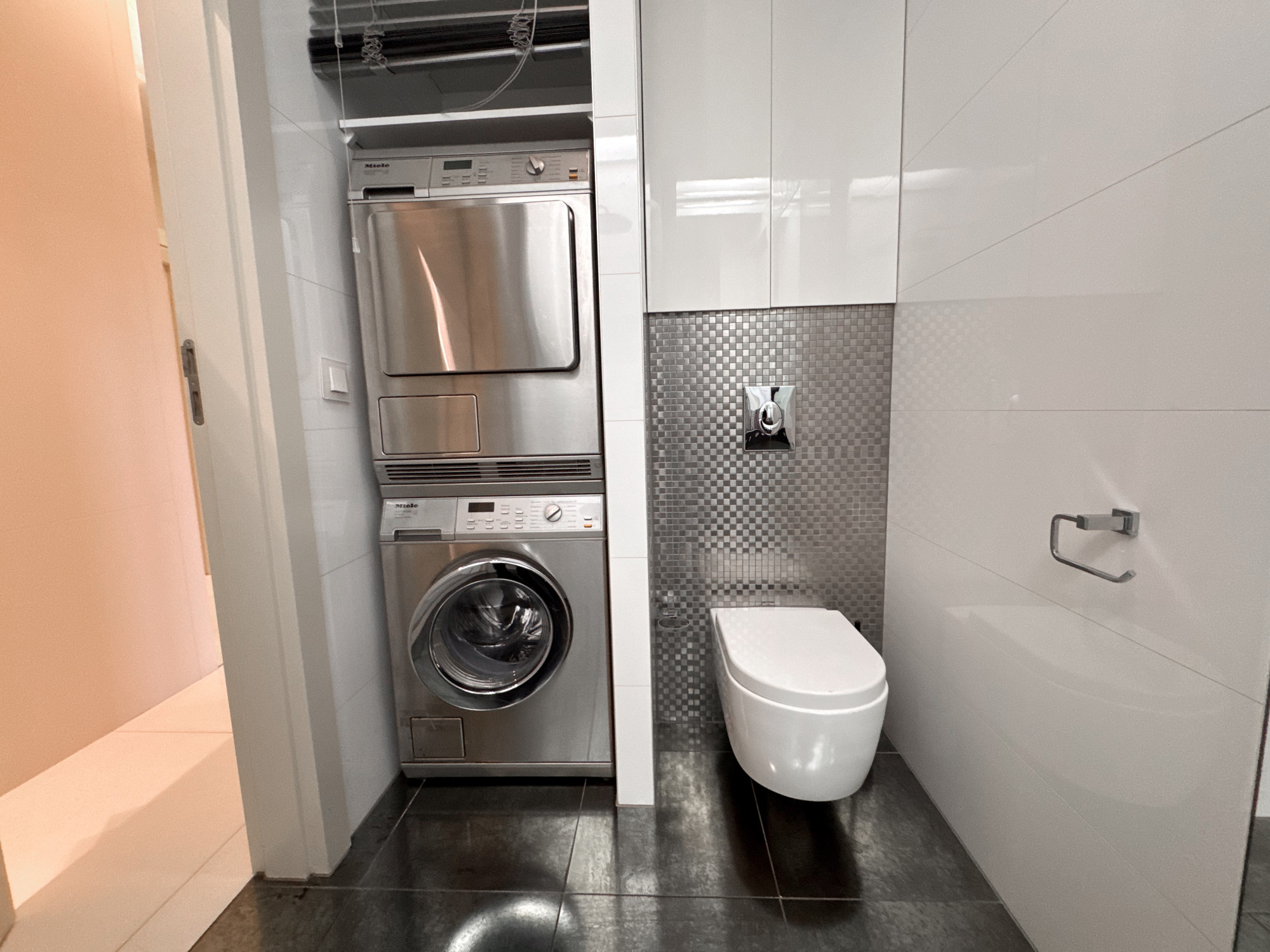 Łazienka ogólna z prysznicem - w łazience sprzęt AGD (pralka i suszarka)